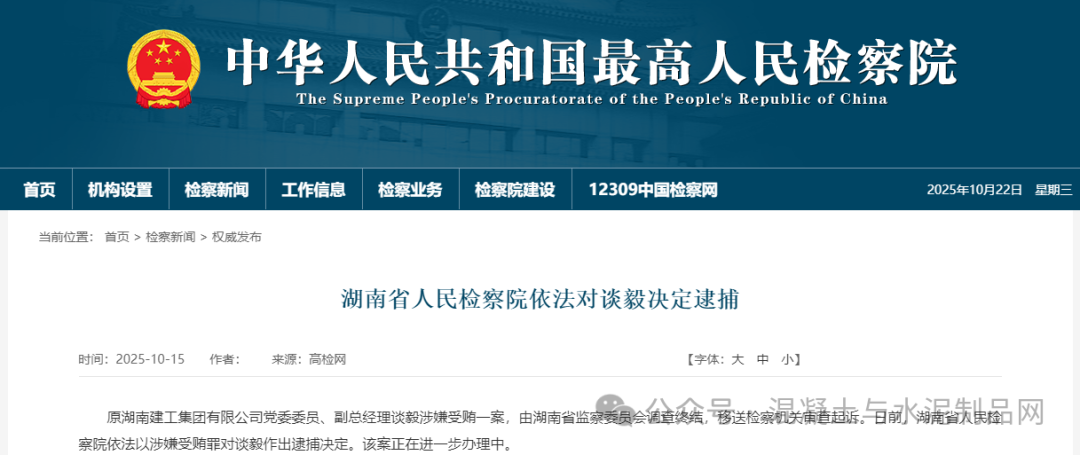 10月15日从最高人民检察院获悉,湖南建工集团有限公司原党委委员、副总经理谈毅涉嫌受贿一案,由湖南省监察委员会调查终结,移送检察机关审查起诉。日前,湖南省人民检察院依法以涉嫌受贿罪对谈毅作出逮捕决定。该案正在进一步办理中。