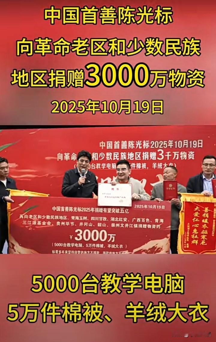 很多人都在质疑陈光标 说他总是太高调了,但是标哥总是用一次次的捐款来回应质疑。这不最近标哥又捐了3000万了。 中国首善陈光标于10月19日,向革命老区和少数民族地区捐赠3000万的物资,包括了5000台教学电脑以及50000件棉被、羊绒大衣。 感觉标哥不是在捐款就是在捐款的路上,就这样的标哥还有人黑吗?为标哥的慈善之举点赞。