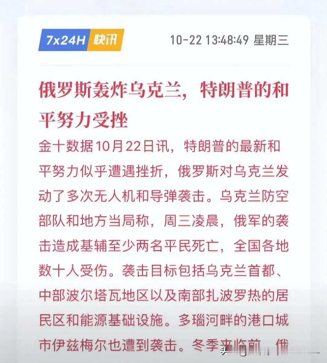 俄乌不可能那么容易停战的,这不停战协议不到24小时,特朗普还在吹嘘阻止了第九场战争,俄罗斯又再度用大量无人机大规模轰炸基辅: 1,美国内部情况变差,自顾不暇,管不了那么多:美国最近发生了最大规模的“反国王”游行,政府也停摆关门20多天,财政则勉强发了上个月工资(军队工资岁发,伙食都变差了) 2,虽然乌克兰已经打得举白旗了,可消耗这么大、死那么多乌克兰人,泽连斯基就算愿意把半个乌克兰割给俄罗斯他也不敢啊 3,欧盟虽然还是会输送武器给乌,可这么长时间的消耗也有些吃不消,再加上各国都有反以色列援助加沙的游行,对俄乌战争也进而更反感 对此,大家怎么看?俄乌会在川普任期内结束吗?
