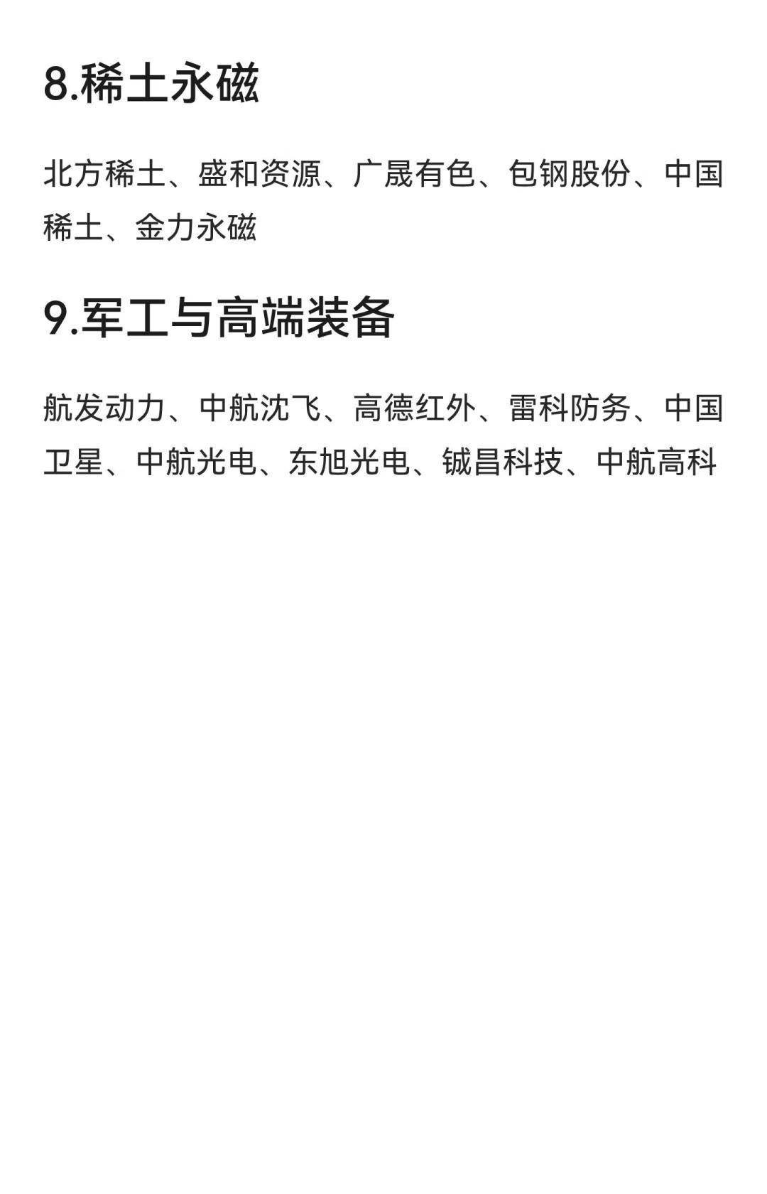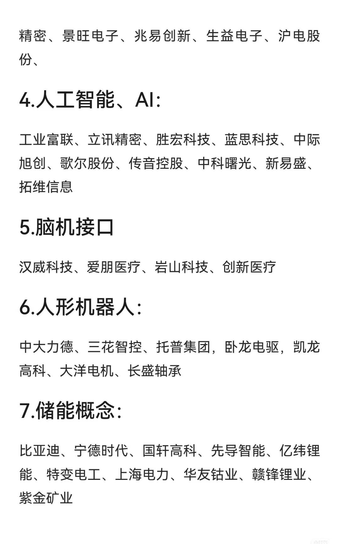 “未来十年适合布局的科技主线核心股” 第一张图片聚焦于芯片、半导体、量子科技和集成电路三大方向: - 芯片、半导体领域包括中芯国际、海光信息、寒武纪、兆易创新、安集科技、澜起科技、通富微电、闻泰科技、张江高科、上海贝岭、雅克科技、沪硅产业、华虹公司、华海清科、中微公司等企业; - 量子科技领域有国盾量子、华工科技、中科曙光、中国长城等; - 集成电路方面则包括深南电路、云汉芯城、胜宏科技、安集科技、东山(文字未完整)等。 第二张图片介绍了更多新兴科技概念及其代表企业,包括: - 人工智能、AI:工业富联、立讯精密、胜宏科技、蓝思科技、中际旭创、歌尔股份、传音控股、中科曙光、新易盛、拓维信息等; - 脑机接口:汉威科技、爱朋医疗、岩山科技、创新医疗; - 人形机器人:中大力德、三花智控、托普集团、卧龙电驱、凯龙高科、大洋电机、长盛轴承; - 储能概念:比亚迪、宁德时代、国轩高科、先导智能、亿纬锂能、特变电工、上海电力、华友钴业、赣锋锂业、紫金矿业等。此外,图片开头还提到了一些未明确归类的公司,如精密、景旺电子、兆易创新、生益电子、沪电股份等。 第三张图片则聚焦于稀土永磁和军工与高端装备两大板块: - 稀土永磁领域包含北方稀土、盛和资源、广晟有色、包钢股份、中国稀土、金力永磁六家企业; - 军工与高端装备包括航发动力、中航沈飞、高德红外、雷科防务、中国卫星、中航光电、东旭光电、铖昌科技、中航高科等九家相关机构或公司。 总体来看,以上系统梳理了未来十年科技发展中多个关键领域(如芯片、量子、AI、人形机器人、储能、稀土、军工等)的核心企业,为关注科技创新与长期投资方向的受众提供了较为全面的参考清单。