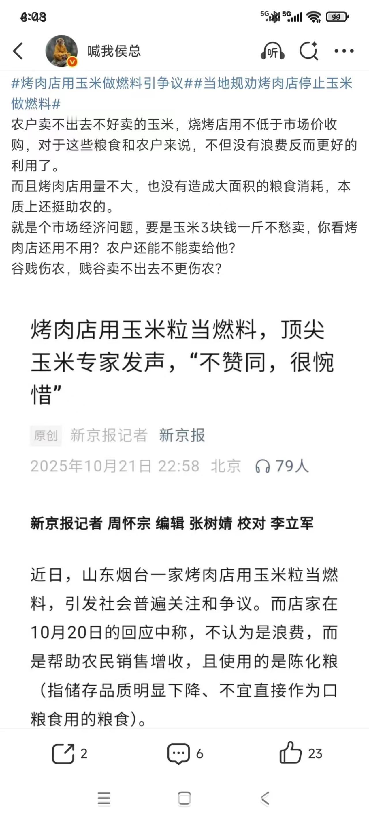 玉米烤肉,不是浪费 山东烟台一家烤肉店,使用玉米做燃料来烤肉,视频曝光后,引来了关注与争议。 媒体采访,老板说在2019年去韩国旅游发现玉米烤肉,随后就花每个烤炉3600元,再以市场价采购玉米,也尝试玉米烤肉。 老板认为玉米烤肉优点明显。比如,不产生烟味,没有致癌物,特别是烤肉有股淡淡的玉米香。 说实话,不清楚这家烤肉店的生意怎么样?就是说,玉米烤肉,消费者是否认同呢? 毕竟,花费比普通烤炉(100多元)多的多的钱采购玉米烤炉,这要是生意清淡的话,岂不就是亏本了。 不过,能够从2019年经营到现在,估计生意应该是不错的。也有人在短视频上,看到过这家店的宣传短片。 显然就是说,这家店的老板与伙计,来这家店消费的客人,包括周围商家或看到视频,也包括当地有关部门,都没有觉得玉米烤肉有啥不妥。 想想也是。不说玉米烤肉那么确切的优点,就说这是老板自己花费市场价,从市场上采购的,采购的也有成化粮。 至于采购后,如何处理,这自然就是老板和店铺的事情了。属于老板的玉米,酿酒、喂猪或者抛弃,这都是老板个人产权,或者说私有财产范围内的事。 顶多,抛弃的话,会有浪费粮食可耻的道德谴责。而用粮食酿酒、喂猪或烤肉,这些做法都是充分利用,没有任何问题的。 当然了,如果玉米价格高的话,老板肯定会评估用玉米烤肉是否划算。不划算的话,肯定也不会使用玉米的。 在这里,我不是说玉米价格低了,而是说老板的抉择与玉米价格有关。老板做生意,也是求财,不会做赔本的买卖。 对此行为,有顶尖玉米专家说,“不赞同,很惋惜”。站在专家角度,尤其是玉米专家角度,这样说当然没有问题。 不过,当地有关部门查遍法规条文,找不到该如何处理,只好建议不使用玉米,这就有点过了。 玉米的用处是什么?有规定吗?就如粮食酿酒一样,对农民来说,只要市场价出售,这就是多赢。 就如有段时间,有关麦子青苗被收割喂牛,引来众多批评一样。纯粹就是吃饱了撑的。对农民来说,出售青苗,或者等麦子成熟出售麦子,有啥区别呢? 或许,有人会说粮食安全问题。国家有大量的陈化粮,如今人们食用的品种多种多样,市场化分工的社会,不会出现“饥荒的”。 有人会说,历史上不是有饥荒吗?对这个问题,已经有经济学家回答了。答案是什么,有人工智能,大家随便查吧。 关键的是,这些玉米对农民来说,就是“多余”的。如此,自然就可以出售换钱。农民也需要其它消费嘛。俗话说,谷贱伤农。这里的意思是谷物价格低了,就会“伤害”农民。 伤害的含义有两个,一个是谷物出售卖不上价,导致农民收入降低。另一个含义就是农民被迫改种其它作物,或者就改行。 那提高玉米价格行不行呢?若是纯粹的市场经济,这价格不是农民说了算,完全是市场经济活动的内容之一。 这个市场活动,也包括玉米的价格会决定烤肉店老板的选择。反正,目前来看,烤肉店老板的选择无可厚非,这样的玉米烤肉也不是浪费。 退一步说,既就是浪费的话,浪费的也只是烤肉店老板的钱,与外人无关,与当地有关部门无关。 也就是说,外人别去说三道四了。如果真心反对这样的行为或做法,最好选择用脚投票,不去吃烤肉就好。 该烤肉店的玉米烤肉,我以为,老板说的有道理。哪怕不是陈化粮,这也是“帮农民将粮食卖出去,拓宽了玉米销路”。