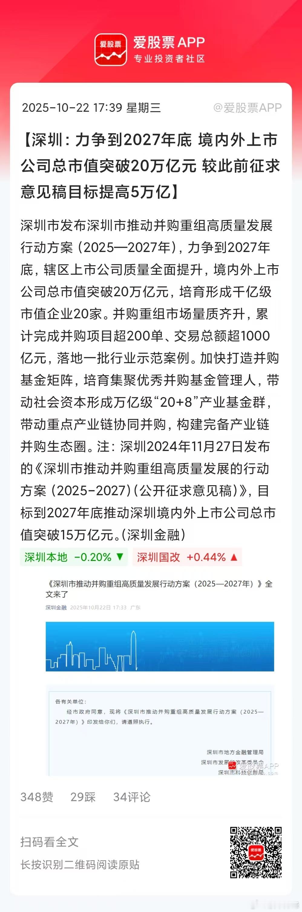盘后深圳来国资利好了,力争到2027年底境内外上市公司总市值突破20万亿元 ,较之前目标提高5万亿!