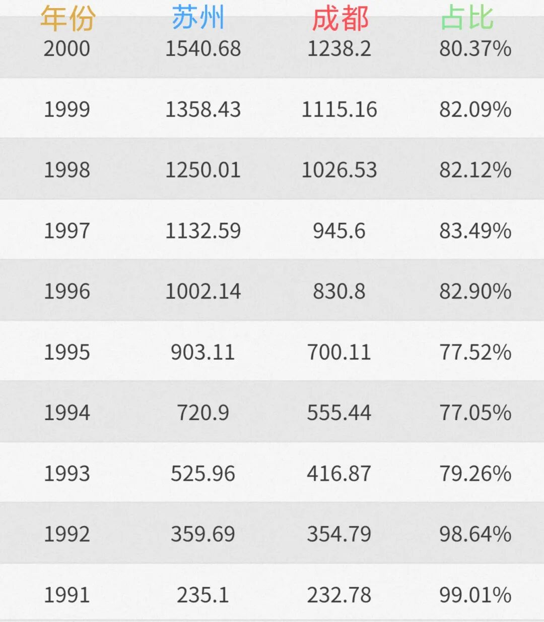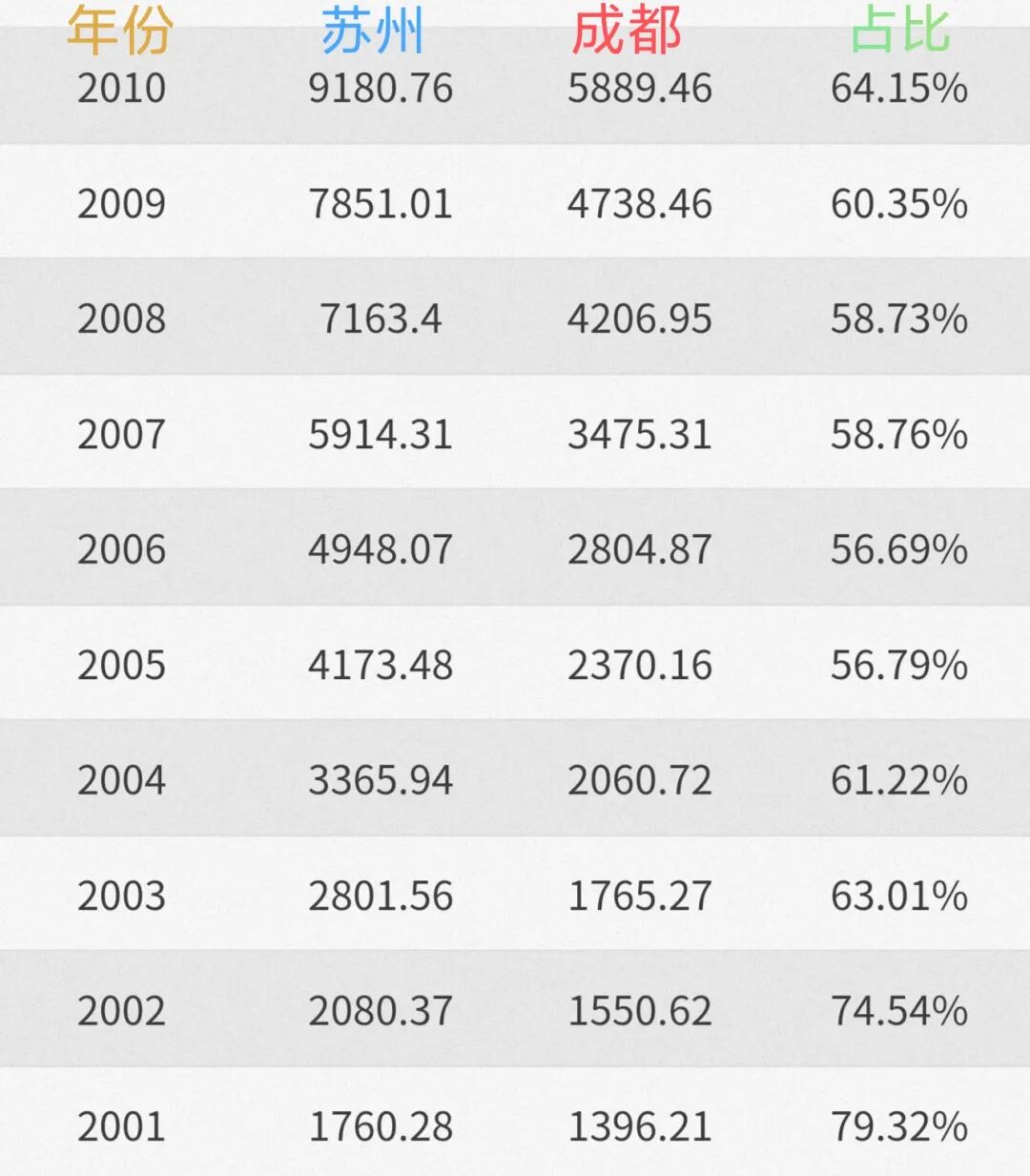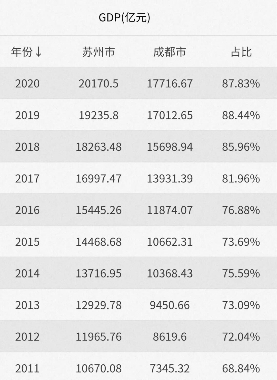 擅长各种流量打法,却始终怀揣一颗工业雄心的成都,与“工业三巨头”之一的苏州,究竟有哪些差距? 想要成为“中国第五城”的成都,能够先实现GDP超过苏州的“小目标”么? 与苏州比工业,成都确实还得练 网络上的成都与苏州,也是一对经济CP。一个是强省会战略第一城,一个是最强地级市,全国城市GDP排名第6和第7让它们相遇,一比就是十余年。 “工业强则经济强”的城市发展定律,在成都和苏州这里展现的尤为明显,工业、制造业方面的硬核实力,决定了两座城市在GDP榜单上的位次变化。 如果以2005年作为对标的锚点,那一年,苏州以4173.48亿元GDP夯实了长三角地区工业重镇的位置,而成都尚未突破3000亿,年度工业增加值占比不足35%。 这个差距在随后的20年还在持续放大。2024年,苏州的GDP超出成都3200多亿元,这个差额基本相当于中西部地区一个中等地级市的GDP总量。增长动能方面,苏州6.0%的增速里,工业贡献了近6成增量,成都的该项数据为4.8%,5.7%的增速里贡献更多的是服务业,提供了7成以上增量。 苏州的工业体量远高于成都。2020年时,两地的工业增加值差额不到2000亿元,2024年已经扩大至7500亿元以上。苏州的规上工业企业平均产值超过2亿元,成都的规工企业均值不足1.2亿元。 当然,苏州的规工利润并没有把成都拉得太远,可见制造业盈利不易,而成都也确实有自己的优秀之处。 苏州在工业领域的底蕴与优势,其他城市难以复制 虽然只是地级市,但苏州能够与深圳、上海一道位居“工业三巨头”,已经说明了其强悍实力。 工信部划分的41个工业大类里,苏州有11个产业总产值超过千亿元,这个比例排在全国前列。 从创新链与产业链的深度融合来看,苏州的全社会研发投入占GDP比重达4.15%,超过成都的3.73%。2024年,苏州高新技术产业产值为25726.3亿元,占规上工业比重为54.7%,而成都的规上高技术制造业增加值仅增长5.7%,装备制造产业还出现了0.8%的负增长。 科技成果转化效率方面,苏州规上工业企业研发机构建有率达80.6%,成都虽有1.45万户高新技术企业,但高校院所的科研成果本地转化率仅为37.18%。 县域经济方面,成都有简阳、彭州和金堂3个百强县,而苏州麾下有昆山、张家港、常熟3个全国百强县前五的存在,其中,昆山的工业增加值数据,甚至可以碾压部分省会城市。 苏州的全域工业强市格局已形成了有序发展梯度,除了深圳,其他城市再难比拟。 从未掩饰“工业强市”渴望的成都,还能做得更好些 电子信息产业是成都工业最亮眼的名片,2024年产业规模达1.36万亿元,稳居全国第六,已形成“芯屏端软智网安”的完整体系。 在人工智能领域,具有后发优势的成都产业规模已突破800亿元,增速超过35%。 同时,成都在低空经济、商业航天等新兴赛道,引进的项目总投资超过800亿元,发展势头良好。 光鲜数据背后,成都工业的短板同样突出。对比苏州汽车制造业7.6%的稳健增长,成都在核心零部件领域的缺失亟待补强。苏州已形成从电池材料到整车测试的完整链条,成都仍以整车组装为主,附加值偏低。 苏州的电子信息产业以集成电路、传感器为核心,虽然被列为全球重要芯片基地,但成都的优势集中在封装测试环节,设计与制造能力薄弱。苏州的电子信息产业利润率达12.3%,成都不足8%。 依托长江黄金水道,2024年苏州港实现货物吞吐量5.98亿吨,集装箱吞吐量966.5万标箱,大宗商品运输成本较低。作为内陆城市,成都的工业物流成本比苏州高出30%以上,能源自给率也才60%,因而在重化工、高端装备等领域的发展空间受限。 在近年来的苏川两地产业对接活动中,参会的成都企业最迫切的需求,是如何获取苏州的产业链配套资源,而苏州企业聚焦的,是如何更好开拓包括成都在内的西部市场。 近年来将大笔资金投入技改与战略性新兴产业领域,展现出了流量成都积极、务实的一面,但与“工业三巨头”的差距,并非短期的努力就能追上。 工业强市的升级并非来自政策的堆叠,而是需要生态的稳定培育。唯有充分发挥西部市场与枢纽优势,将流量红利转化为人才吸引力,全面提升科研成果的本地转化率,成都的工业雄心,才能真正转化为新的核心竞争力。