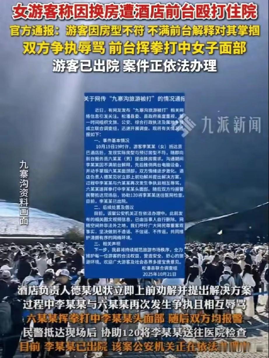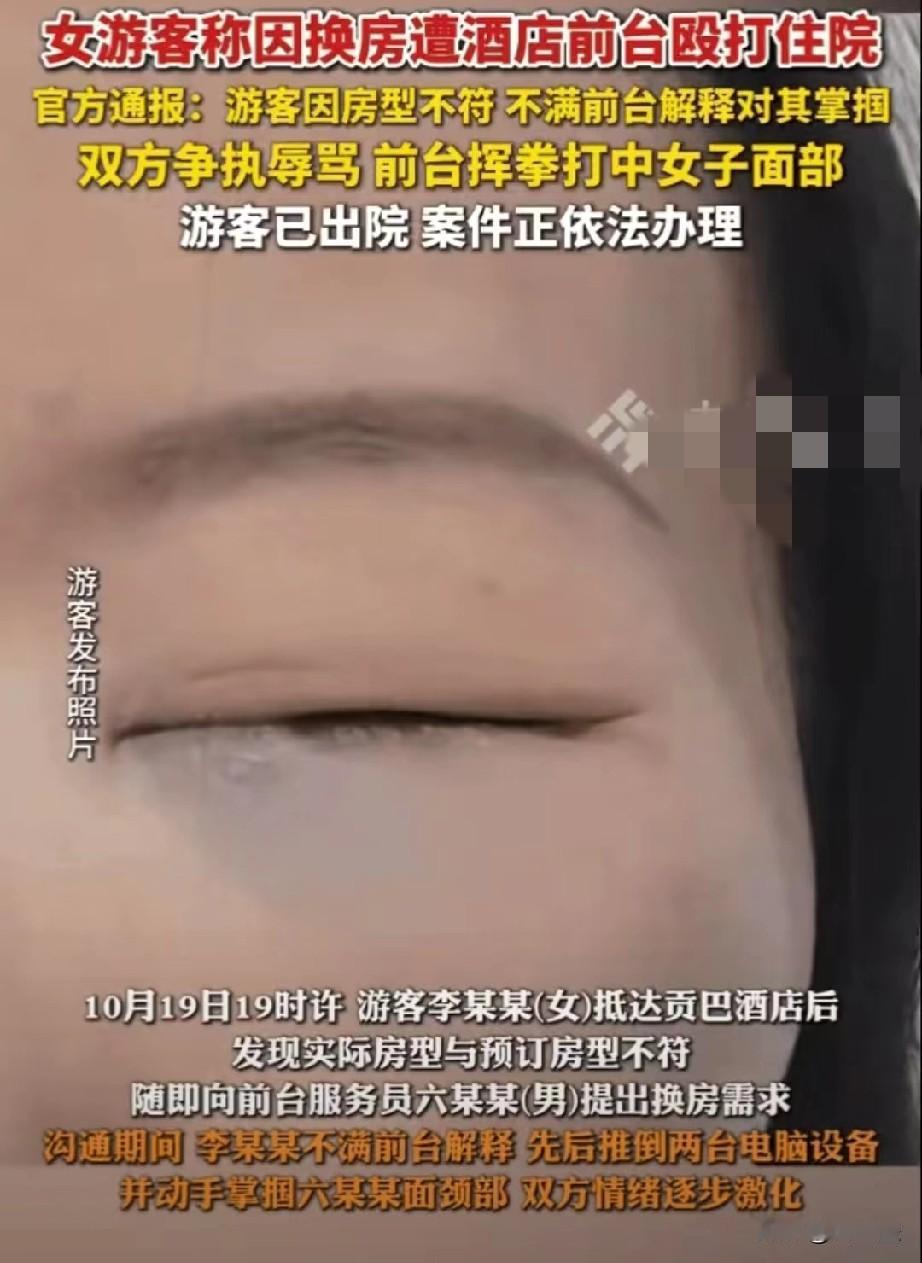 又一位被社会毒打的女人,又菜,还要耍横,真是不知天高地厚,竟然敢挑战男人的耐心,谁给她的勇气呀? 近日一名女子在九寨沟旅游,住酒店时发现房型与其所预定的不同,他以酒店前台提出换房要求,不知道男服务员与她说了什么,她愤怒的推倒两台电脑,还给男服务员扇了嘴巴子。 打人不打脸不知吗?特别是男人的脸,她完全是在作死,挑挑战男人的自尊心,男服务员放过她才怪。 她打了男服务员的脸,他并没有还手,但在第2次发生争执中,男服务员直接在她脸上一拳捶。 该女子被打鼻青脸肿的,毁容了,图啥呀你,报了警,警方在处理中,该女子已经出院。 虽然双方报警了,该女子如果想要赔偿的话,估计不太可能,毕竟人家有证据,这是正当防卫,你打人在先。 预订房型不符确实闹心,但可好好沟通,要么免费升级房型,要么补差价,总有解决的办法是不是? 但你动手推电脑,还扇人嘴巴子就过分了,男服务员这一拳算是让她明白,社会可没人惯着坏脾气。 如果是我就不还手了,让她发泄够了打够了,就打个110,后面就好玩了,定损,验伤,慢慢玩,看看她用多少诚意来打动你签和解书。 你们觉得呢?