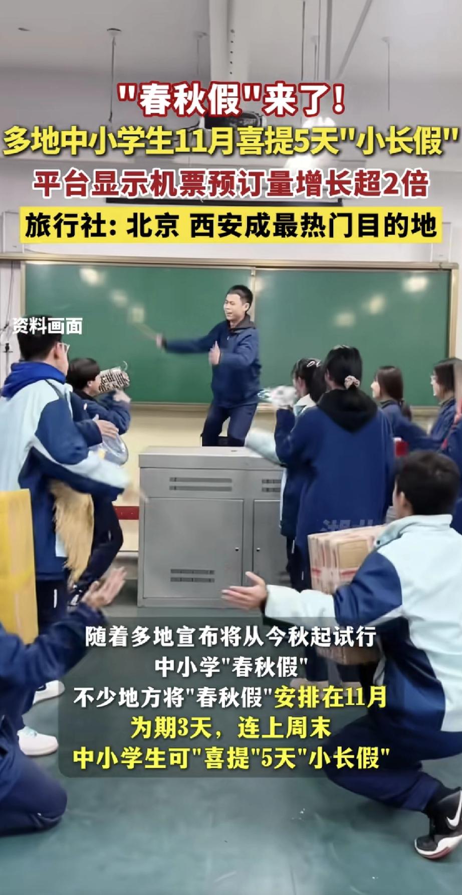 这事儿是真的好?最近不少地方陆续宣布,要给中小学生放“春秋假”了。 具体怎么放呢?一般是安排在5月或11月,放假3天,再加上前后周末,孩子们就能凑出个5天的“小长假”。消息一出,可把大家乐坏了,平台上机票预订量一下子涨了两倍多,北京、西安成了最热门的旅行地。 其实,增设春秋假是为了让孩子们在紧张的学期中能放松一下,错开旅游高峰,也多点机会走进大自然。看来,以后孩子们除了寒暑假,又能多盼两个假期啦!