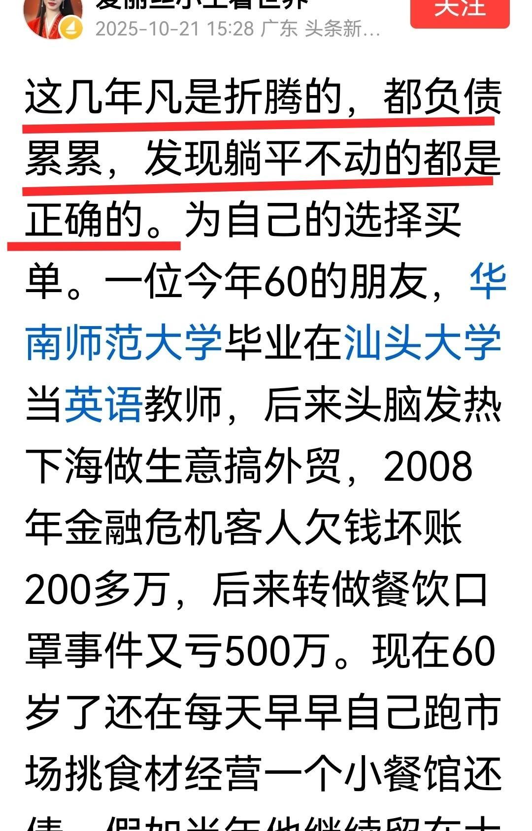 令人深思反省!应该鼓励“创业进取”还是引导“躺平不动”? 为此,该网友还举了个身边的现实案例,一朋友舍弃好好的汕大教师岗位,非要下海经商,结果亏了大几百万,至今人到60了,还在经营个小餐馆艰难还债。 呵呵,倘若朋友不下海经商闯荡,如今凭着不菲的退休工资,也能过得悠哉悠哉。 猛一看,该网友的观点不无道理。少折腾自然少风险,不经商创业哪会有债务,更遑论为自己的行为买单。 但诚如有网友犀利指出的那样,若一个民族,都倚靠国家高额退休金,不敢折腾,不敢创业,没有进取心,到头来必将被其他有进取心、敢冒险的民族所取代。 是啊,如果都选择躺平不动,选择四平八稳的不创业不经商,追求稳定的退休工资,推动社会进步发展的创新创业和拼搏进取,又何尝不是一句空话呢? 所以,我们必须从完善创业、创新激励机制入手,譬如区分恶意逃债和创业失败等实际情况,及时改进创业失败后的“限高令”等规定,研发鼓励“东山再起”的机制,在全社会兴起一种拼搏进取、创业创新的良好氛围。 对此,大伙怎么看?请评论区里抛出你的意见。