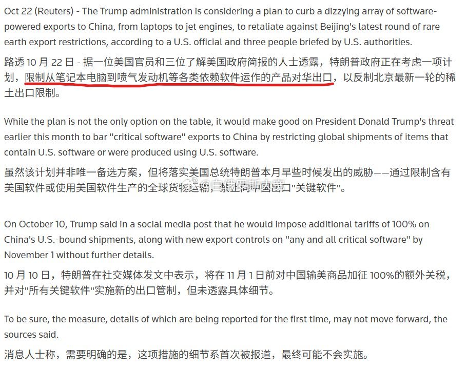 10月22日路透社报道,美国正在考虑一项计划,限制出口含有或使用美国软件制造的商品至中国(从笔记本电脑到喷气发动机)。特朗普的威胁的不只是限制关键软件对华出口,而是各类依赖软件运作的产品都限制,这几乎包含了所有科技产品。 美国总统叫板美国前总统