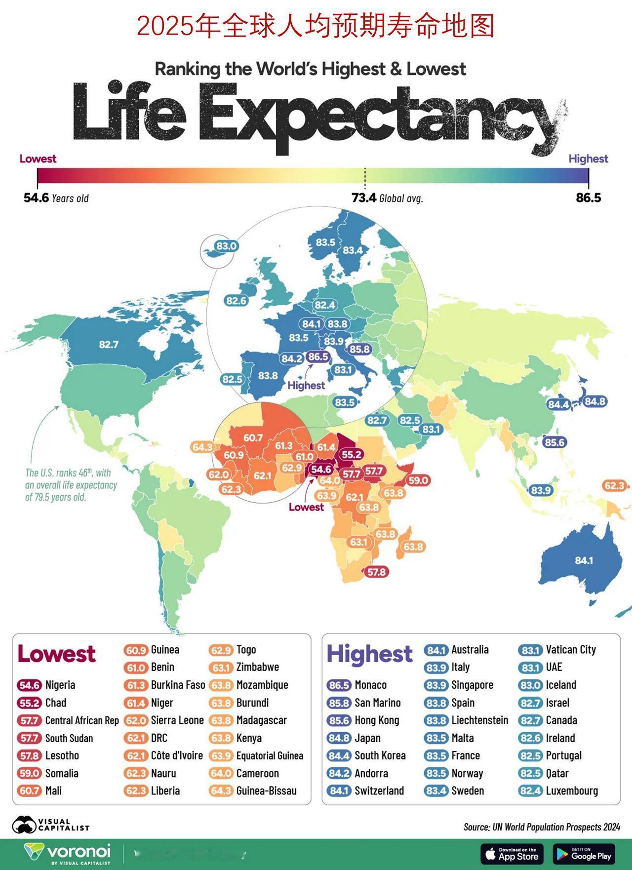 哪里的人均预期寿命长?来看2025年全球人均预期寿命地图 人们的寿命长短不仅仅受遗传因素的影响,医疗条件、饮食习惯、基础设施以及收入水平等因素也都对一个国家和地区的平均预期寿命有着重要影响。 这张信息图表利用联合国提供的数据,直观地展示了 2025 年全球各地男女的平均预期寿命情况。 ——那里的人能活得最长久? 在榜单前列的是那些规模较小但经济发达的东亚和欧洲国家,而撒哈拉以南非洲地区的新兴国家则排在榜单末尾。在全球范围内,平均预期寿命为 73.4 岁。 摩纳哥居民的平均寿命为 86.5 岁,是全球最高水平,紧随其后的是圣马力诺(85.8 岁)、香港特区(85.6 岁)和日本(84.8 岁)。这些国家和地区普遍实行全民医疗保健制度,犯罪率低,拥有强大的社会保障体系,且饮食以海鲜为主,加工食品摄入量低。 在主要经济体中,澳大利亚(84.1 岁)、韩国(84.4 岁)和意大利(83.9 岁)在全球范围内处于领先地位,而中国则落后于这一水平,为 78.0岁,排名在前 50 位之外。 在所有国家中,女性的平均寿命都长于男性,全球范围内平均相差 5 年。而在俄罗斯,这一差距达到了近 12 年,比其他任何国家都要大。 ——预期寿命最低的地方 在另一端,撒哈拉以南非洲地区的部分地区,人均预期寿命仍低于 60 岁。尼日利亚的预期寿命最低,平均每人预计能活 54.6 年,其次是乍得(55.2 年)和中非共和国(57.7 年),这些国家的预期寿命在全球范围内处于最低水平之列。 这些国家中有很多都面临着持续存在的问题,比如医疗资源匮乏、营养不良以及婴儿死亡率过高。 ——全球预期寿命差距 在全球范围内,人均预期寿命持续上升,但寿命最长人群与寿命最短人群之间的差距依然很大,摩纳哥和尼日利亚之间的差距甚至超过了 30 年。 随着发展中国家加大对医疗保健和教育的投入,这种差距可能会缩小。然而,在富裕国家,诸如心脏病和糖尿病这类与生活方式相关的疾病却给延长寿命带来了挑战。