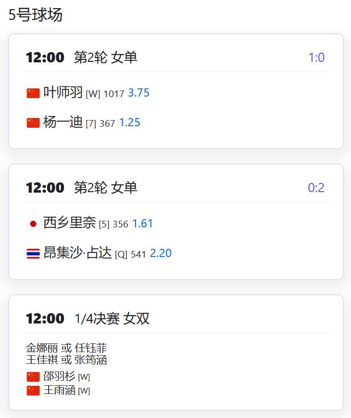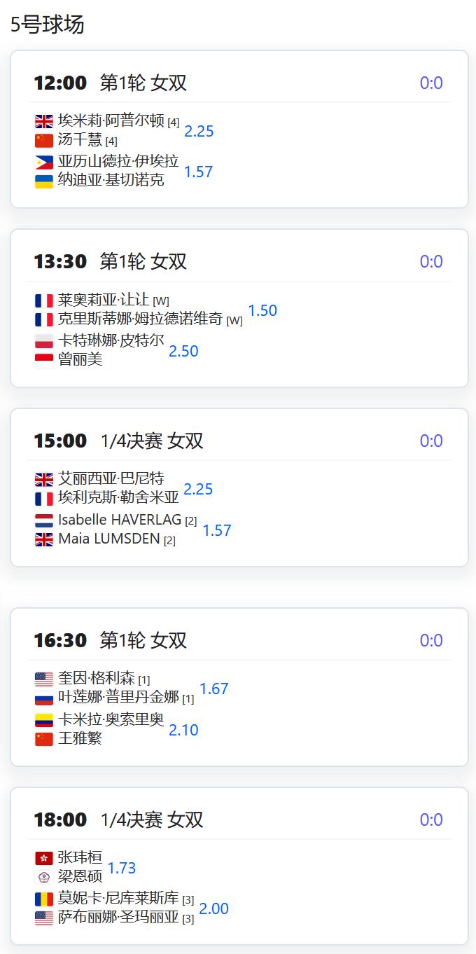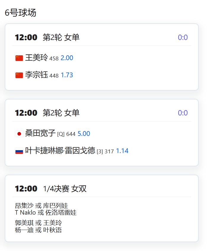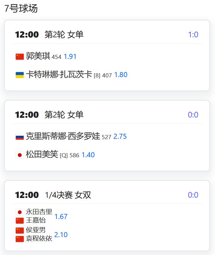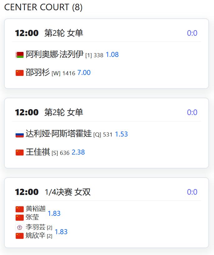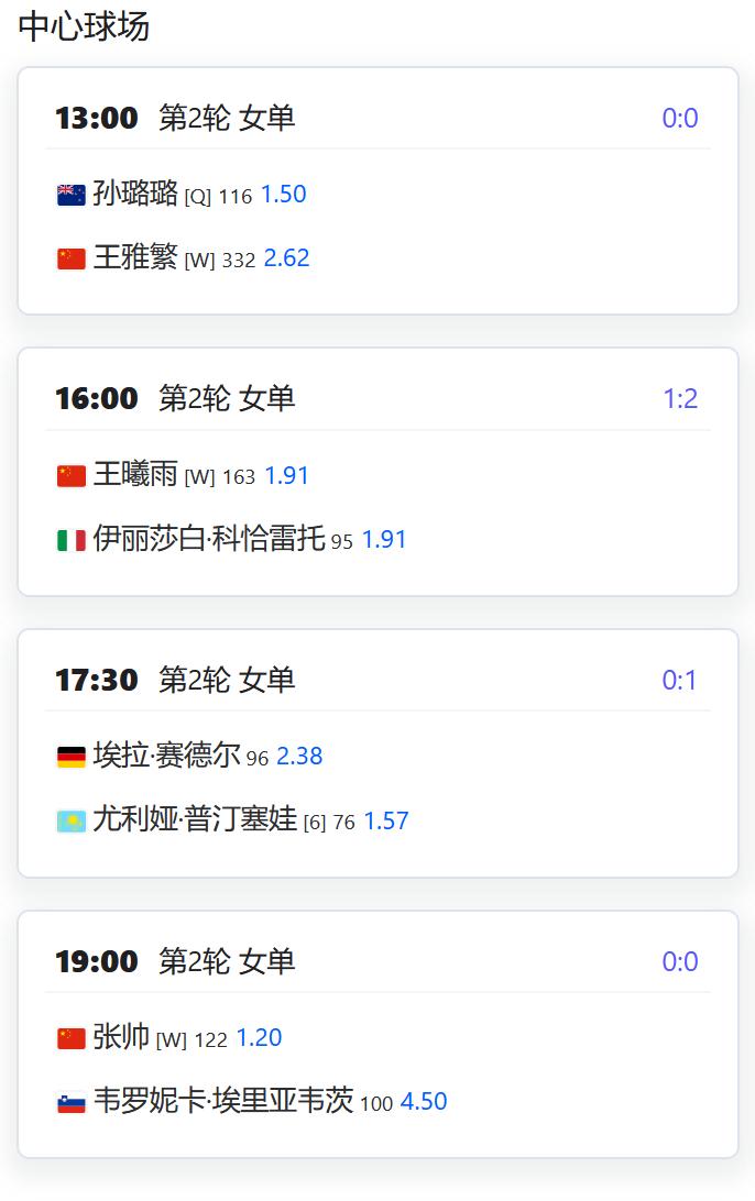 今日赛程: WTA500赛东京站,女双四分之一决赛,蒋欣圩/詹皓晴将对阵头号种子佩雷斯/汤森德; WTA250赛广州站,昨天的比赛因雨全部取消,推迟到今天进行。 王雅繁、王曦雨、张帅先后出战单打,汤千慧、王雅繁则将出战女双; W35千岛湖,女单第二轮,小将邵羽杉将对阵头号种子法列伊; 王佳祺对阵资格赛球员阿斯塔霍娃; 叶诗羽对阵7号种子杨一迪; 王美玲对阵李宗钰; 郭美琪对阵8号种子扎瓦茨卡; 女双四分之一决赛,黄裕迦/张莹对阵2号种子李羽芸/姚欣辛; 侯亚男/袁程依依对阵王嘉怡/永田杏里; 邵羽杉/王雨涵对阵金娜丽/王佳祺与任钰菲/张筠涵之间的胜者。