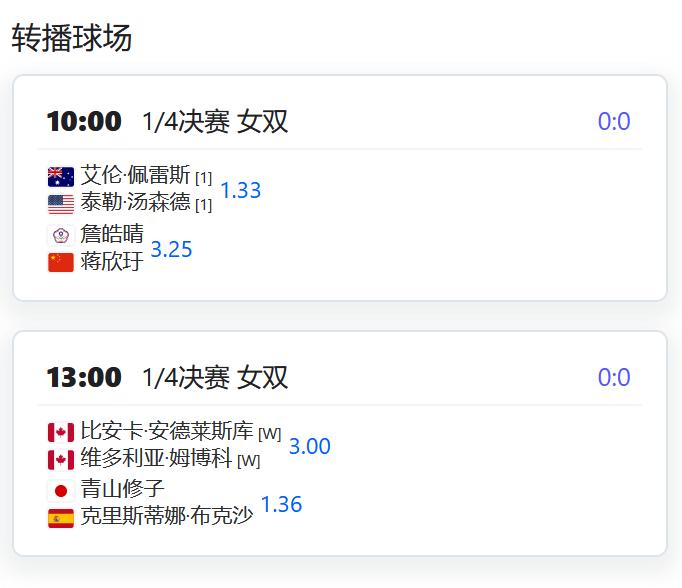 今日赛程: WTA500赛东京站,女双四分之一决赛,蒋欣圩/詹皓晴将对阵头号种子