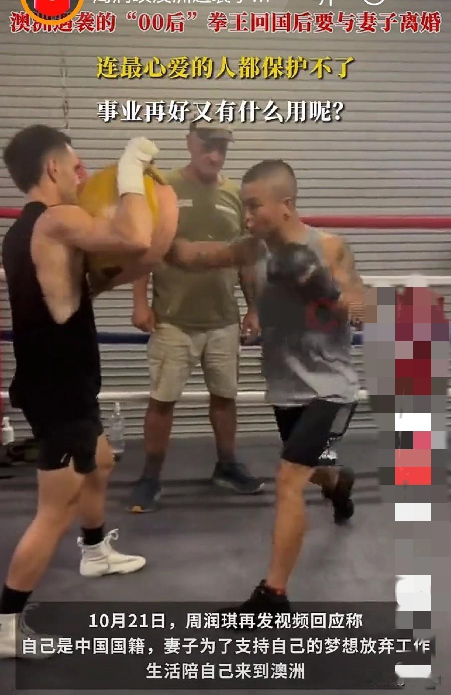 太憋屈!河南00后拳王在澳洲遇袭,想还手却被老婆拦住,差点被打死。 近日,河南职业拳击手周润琪,在澳洲坐公交车突然被遇袭!几个当地土著人莫名其妙搞了种族歧视,叫他们滚出去,别来他们家地盘。还动手打了他和他老婆! 有个女的先冲上去扯他老婆头发,周润琪肯定不能看着啊,刚要起身拦,后脑勺就挨了拳头。他当时本能就想还手,毕竟是练家子,结果他老婆死死把他拉住了,就怕他一还手,万一被人拍下来,职业拳击这边就得给他禁赛,职业生涯就毁了。 结果这一拦,对方更嚣张了,直接把周润琪推倒,还拽着他老婆头发往车下拖,在路边接着打。 等警察来的时候,周润琪都昏迷十分钟了,送医院一查,脑袋又有瘀血又脑震荡,他老婆浑身是擦伤。 最糟心的是,他本来要去开大洋洲冠军卫冕战的发布会,这么一耽误,卫冕的机会直接没了。 后来周润琪越想越气,接受采访时那叫一个憋屈,“我在拳台上能打赢对手,却护不住自己老婆,再能打有啥用?” 这事儿想想就窝火,他老婆是担心他的事业,可眼睁睁看着家人受欺负不能还手,这滋味谁能受得了? 你说这事儿多讽刺?职业拳手遇上街头暴力,明明能还手却只能憋着,就因为他老婆怕他丢了工作,怪不得现在想离婚,确实越想越气啊。 (图片来自网络视频)