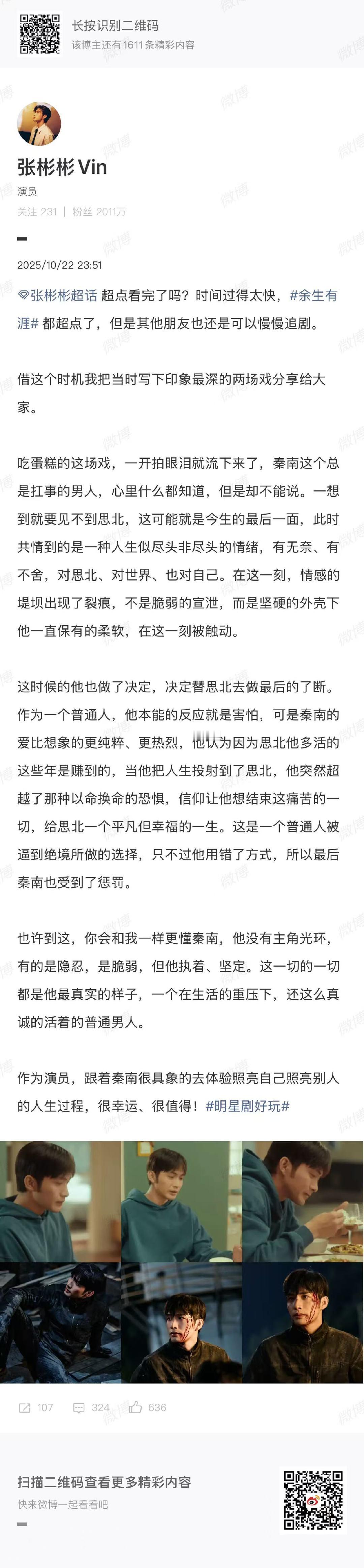 张彬彬余生有涯印象最深的两场戏,是彬彬的大结局发文,满分真诚感的长文,很好的角色诠释,大结局快乐,你的故事未完待续!