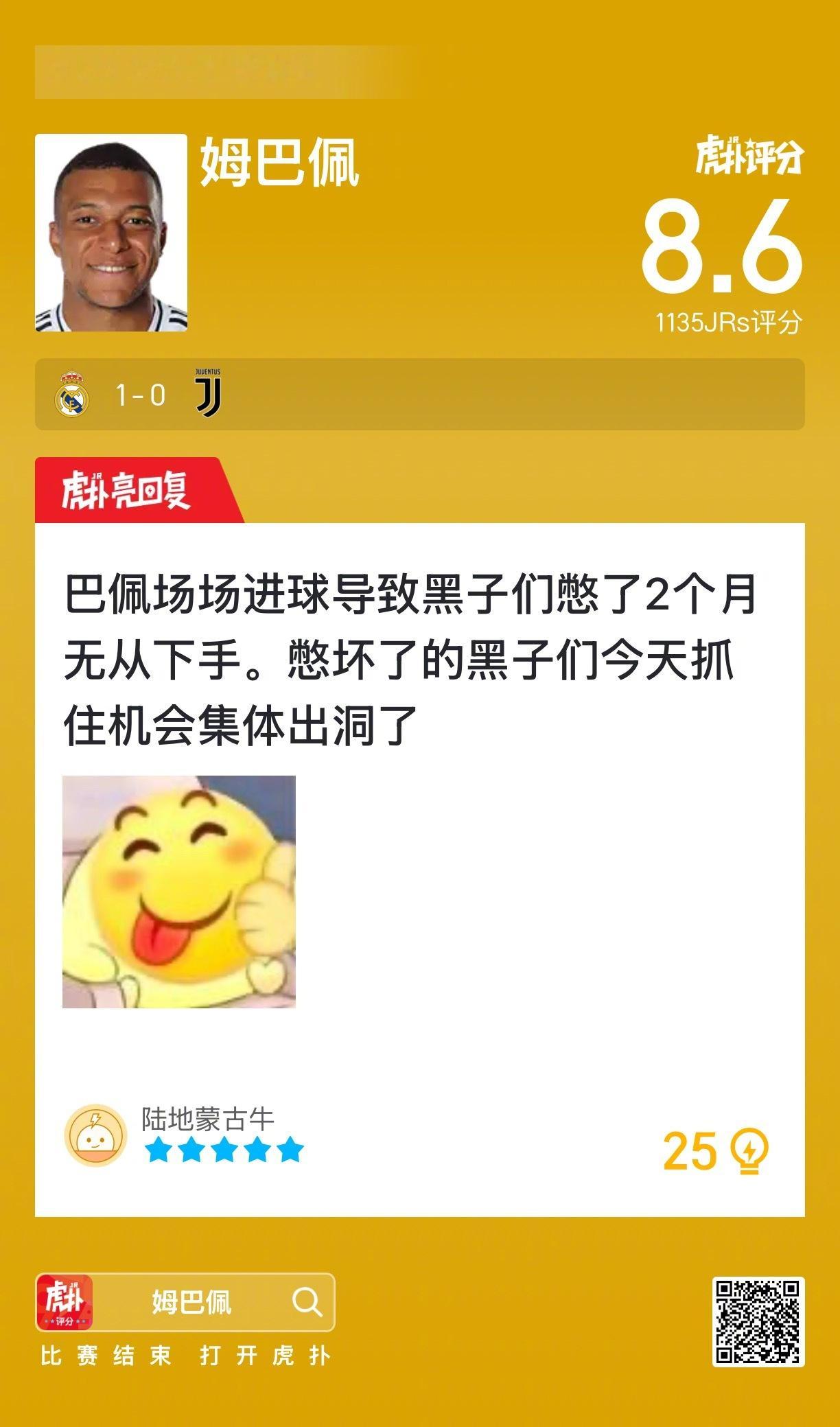 皇马1比0尤文图斯姆巴佩赛后收获8.6的虎扑评分!