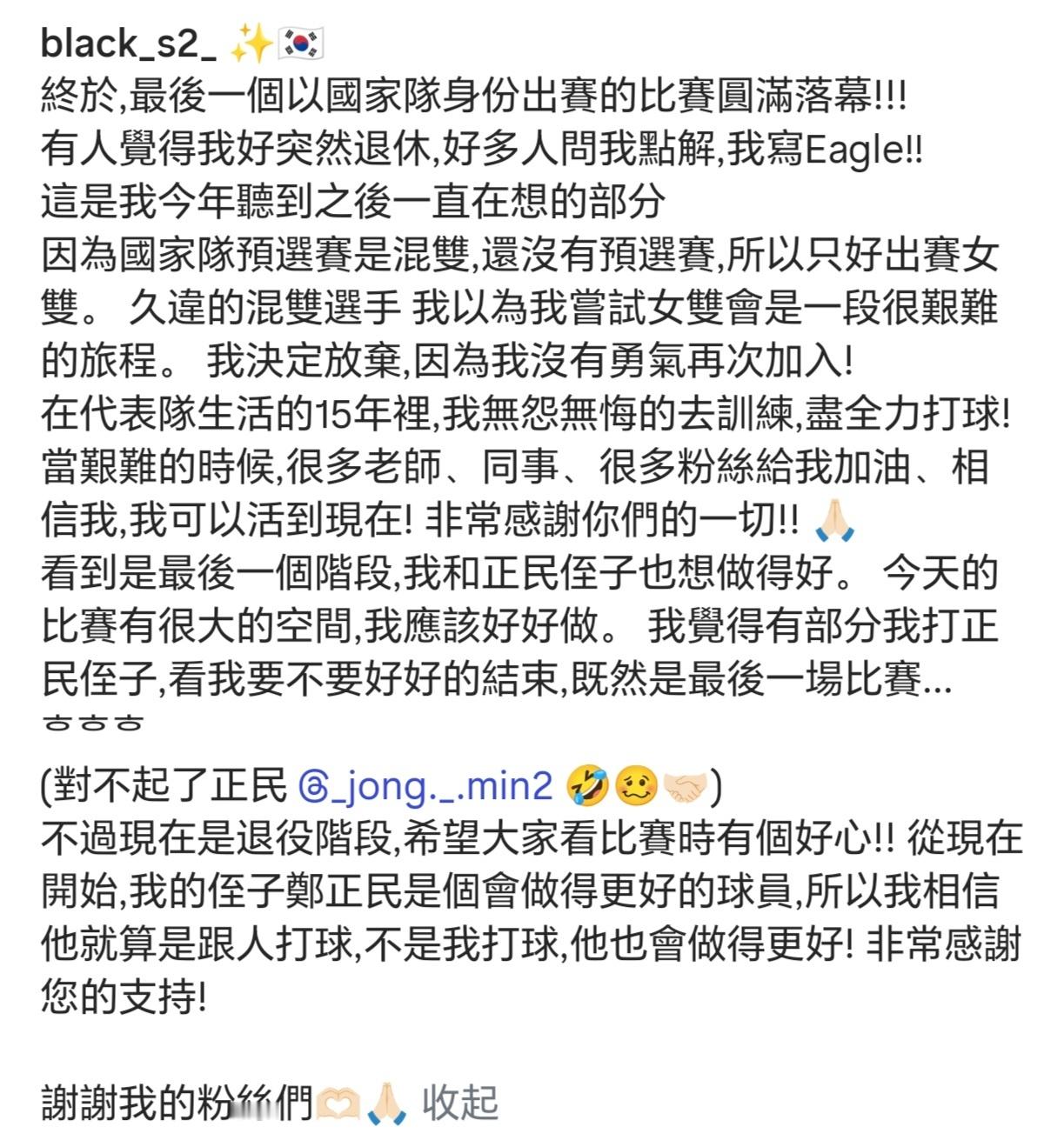 蔡侑汀退役,黄东萍送上祝福。谢谢蔡姐在今年苏杯贡献了最好看的混双比赛。祝未来皆美