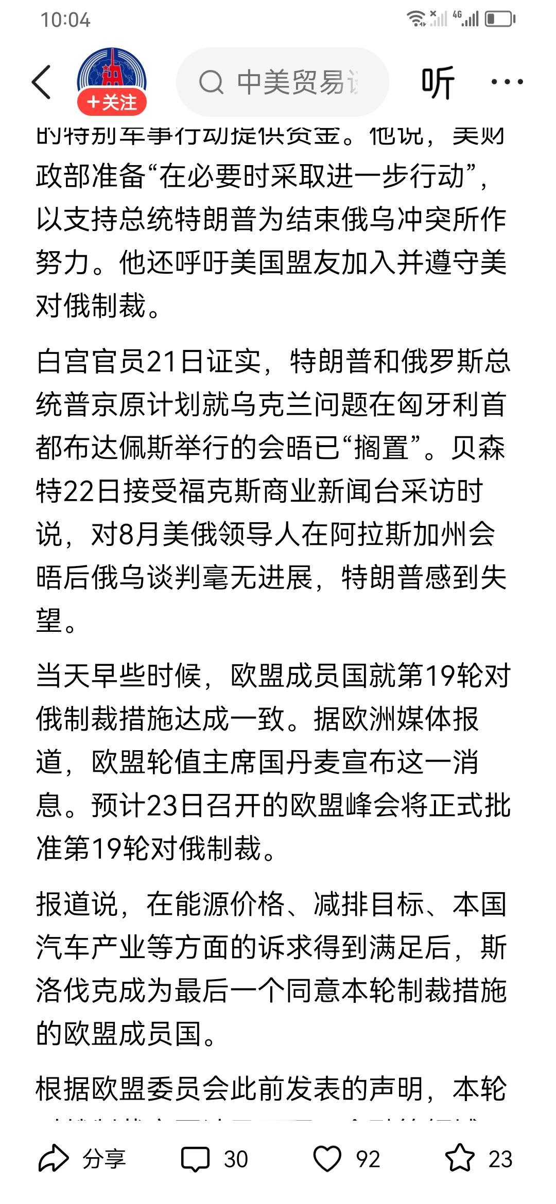 央视新闻,美与欧洲共同发起对俄罗斯第19轮制裁,禁止俄油气进入欧洲,具体制裁俄油船,两家油气公司。这标志着完全切断了西中欧的俄罗斯油气资源通道。俄油价上限被规定为47、6美元/桶。另有金融交易制裁。 这下,俄罗斯的战争资金越来越紧张了。前线士兵,包括雇佣兵都是拿钱干活的。没钱仗还打得下去吗。 俄罗斯的经济己进入战争模式,一切为了前线作战。为了筹备资金,俄罗斯已没收了多个贪官家庭资产,用于战争。 但俄罗斯人也许会不要钱,吃饱就行,拿武器上战场。只要粮食充足,武器有保障,不拿工资也行。 拿了钱无命消受,说不定牺牲在战场。 俄罗斯还有个大靠山。东方贸易不断,与中印关系不错,腾挪余地还是很大的。 美欧的制裁也许想引起俄内乱。也让俄增加困难,主动求和。