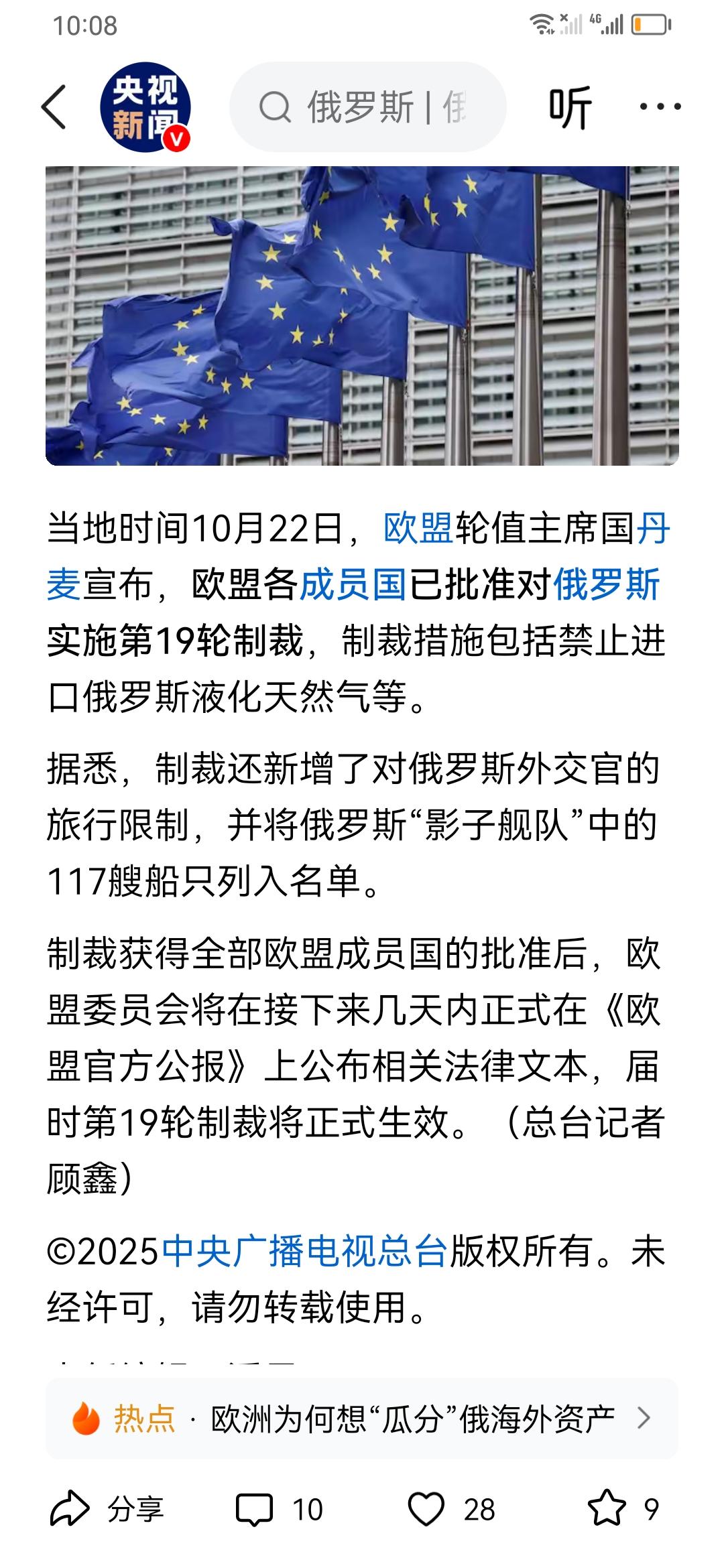 央视新闻,美与欧洲共同发起对俄罗斯第19轮制裁,禁止俄油气进入欧洲,具体制裁俄油