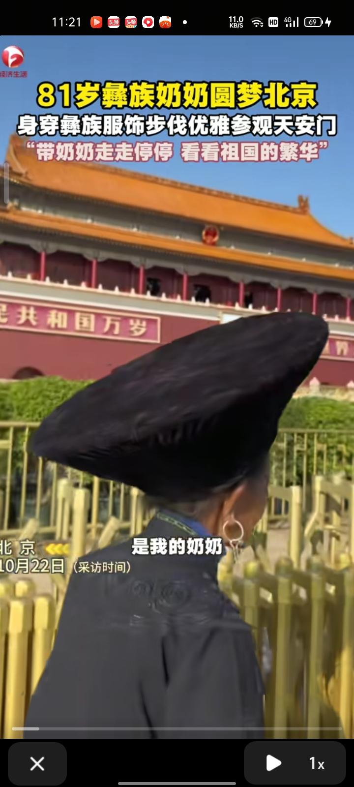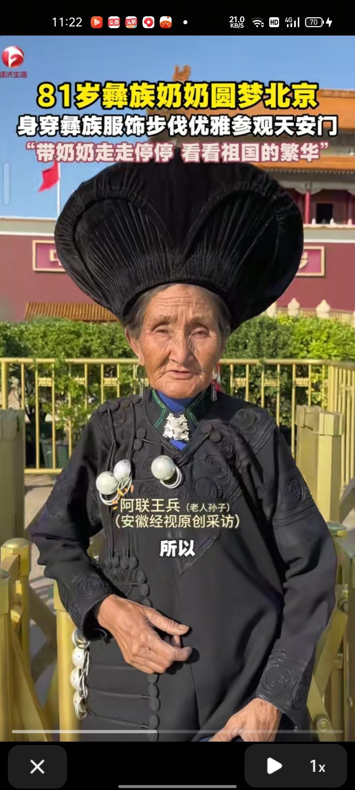 10月21日,北京。81岁的彝族奶奶身穿彝族服饰来到北京,步态优雅参观天安门。 老人孙子介绍,奶奶有个北京梦,想带着奶奶出门看看祖国的繁华,所以带她看看伟大的毛主席、庄严的天安门和万里长城,这次旅行持续一周左右。