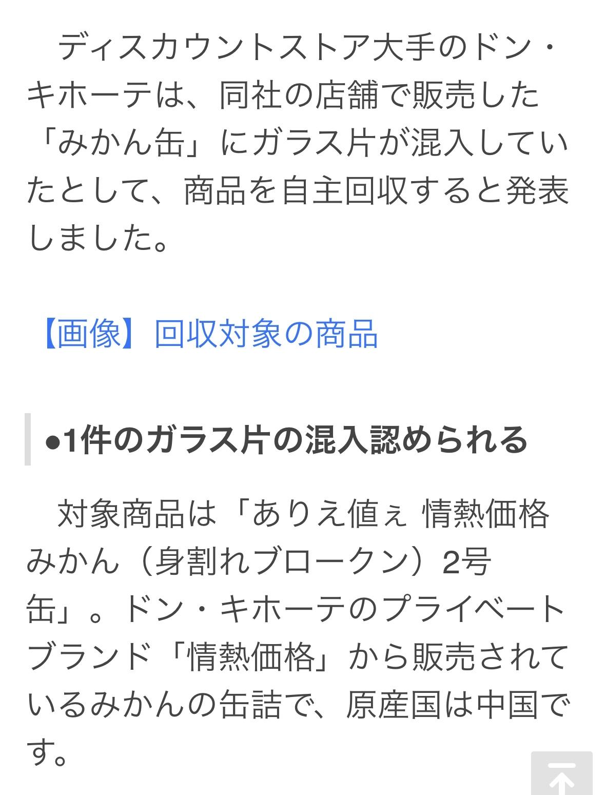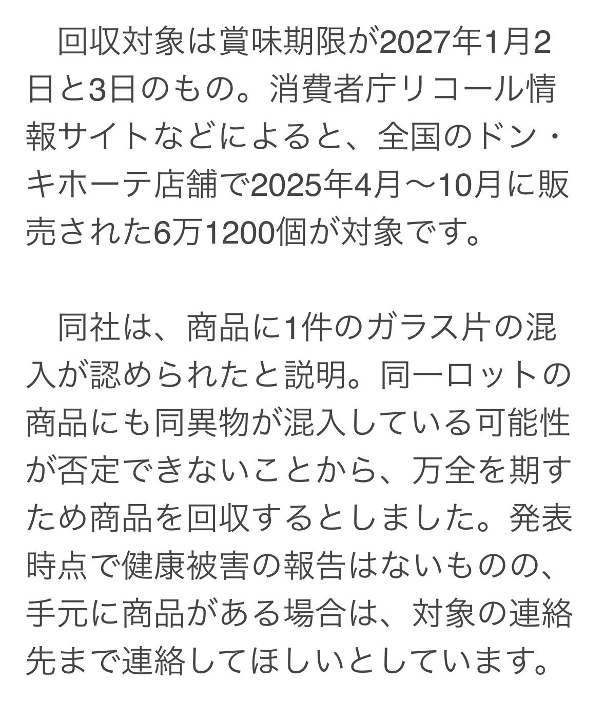 唐吉诃德主动召回6万个中国制造含有玻璃碎片的罐装柑橘,并表示最深切的歉意。 召回产品为2号罐装柑橘,保质期2027年1月2日~3日。2025年4月~10月在日本唐吉诃德销售的61200件商品。 在该产品中发现了一例玻璃碎片。由于不能排除在同一批次的产品中也有同样的异物,以防万一决定召回。截至发布公告尚未收到任何健康问题报告,有对象商品的希望联系。