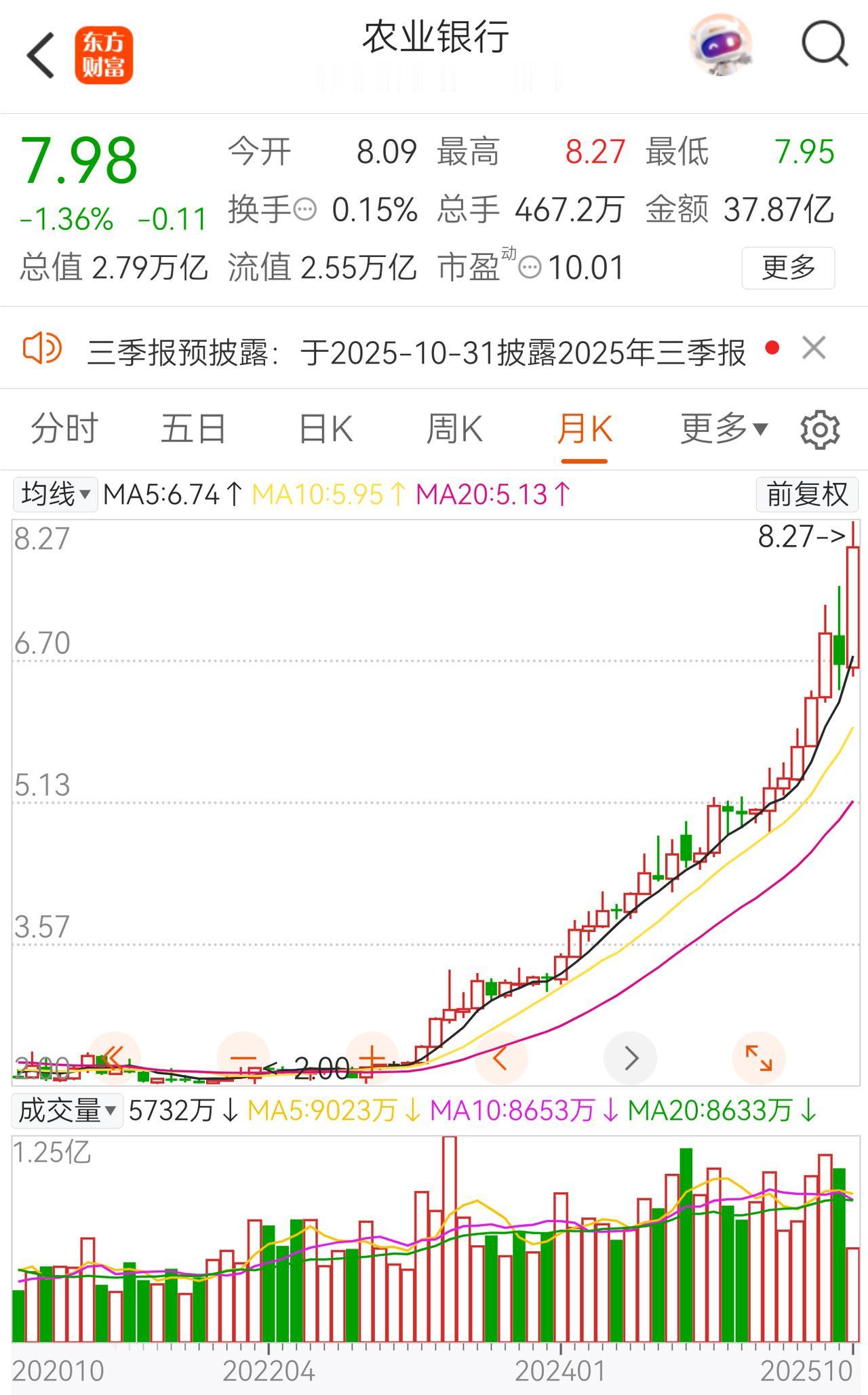 【农行15连阳累涨近25%】10月23日,农业银行继续走强现涨近1%,9月25日以来走出15连阳累计涨幅近25%,总市值逼近2.9万亿。 银行属于金融市场的压舱石,在股市没有大风险的时候,连续暴涨。等到泡沫出现,银行还能稳住金融市场吗?