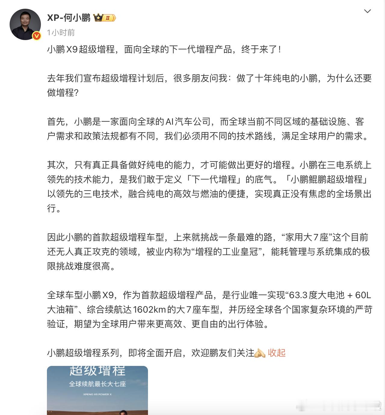 何小鹏小长文聊为什么要做增程以及为什么是从小鹏 X9 开始。