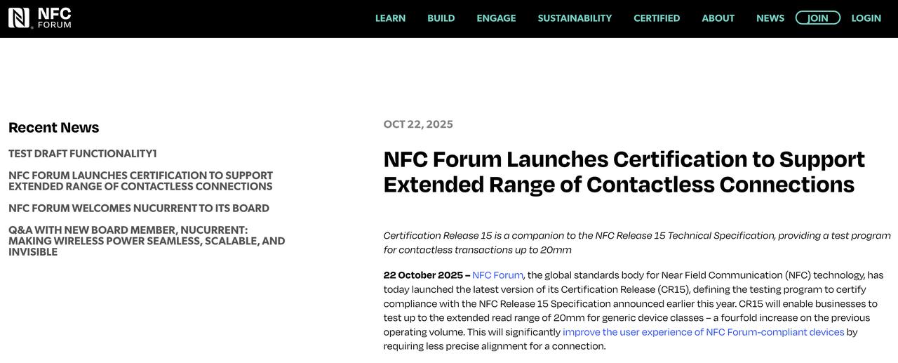 📶 NFC 进入“远距时代”:官方推出扩展范围认证,支持 6 倍通信距离 NFC Forum 宣布推出全新的“Extended Range Certification”(扩展距离认证)计划,正式支持超出传统 5 厘米限制的近场通信标准化测试,这意味着未来的 NFC 不再局限于“贴一贴”。 该认证将覆盖支持新一代高功率发射与灵敏接收机制的设备,旨在确保在更长距离(官方未公开具体数值,但预计可达 4–6 倍)下,仍能实现安全、稳定的数据交互。 NFC Forum 表示,这一举措将显著扩展 NFC 的应用边界—— 从移动支付、身份认证,延伸到门禁、汽车数字钥匙、仓储物流、IoT设备通信等场景,尤其对智能家居与工业控制系统意义重大。 业内分析认为,延长通信距离意味着 NFC 正在与 UWB(超宽带)与蓝牙 LE 等近距无线协议重新划分边界;如果各大芯片商能快速适配此认证,未来的智能手机与门禁设备或许能在“非接触”条件下直接识别与认证。 🔹 你觉得“远距NFC”会成为智能门锁、车钥匙的新标准吗? NFC 近场通信 无线标准 物联网 智能家居