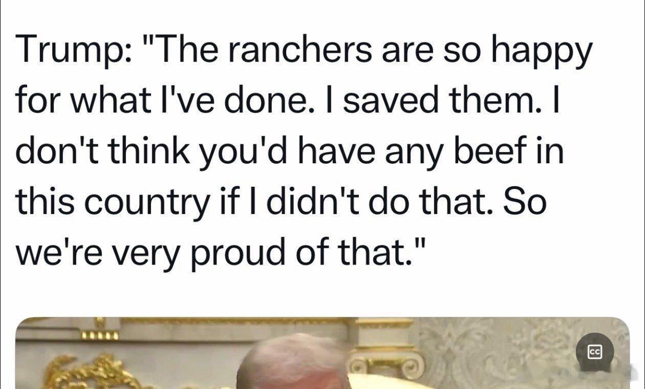 Trump:那些养牛的,根本不懂,他们几十年来第一次挣钱,是因为我的关税,否则他们会很惨…我拯救了他们,要不是我,这个国家会没有牛肉…