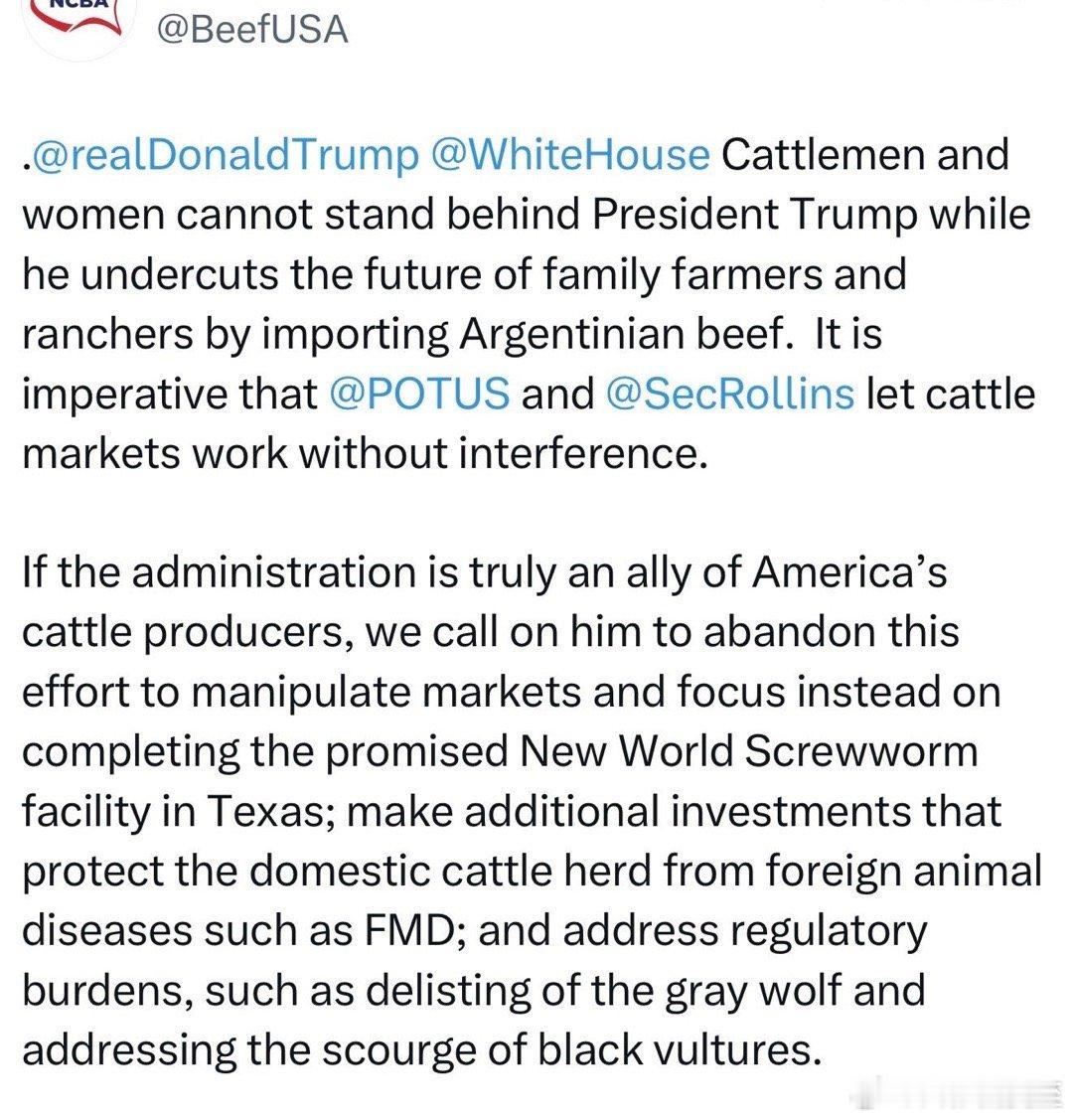 美国牧牛协会:我们不支持进口阿根廷牛肉,会影响我们的未来,总统和农业部不该干预市场…如果这届政府真的想帮助美国牧牛农场,我们呼吁他放弃干预市场的想法,做实实在在的事,例如减轻法规负担…