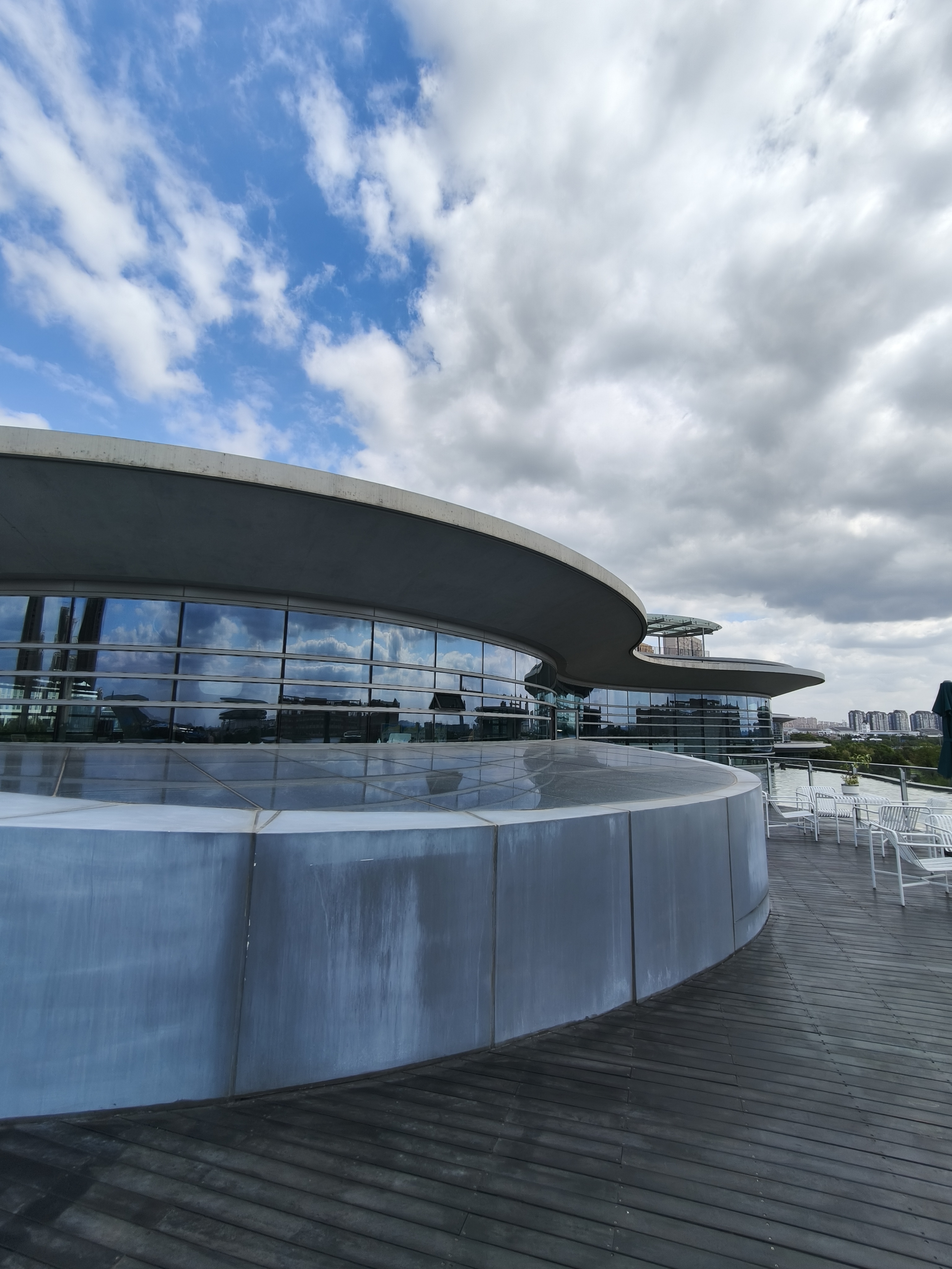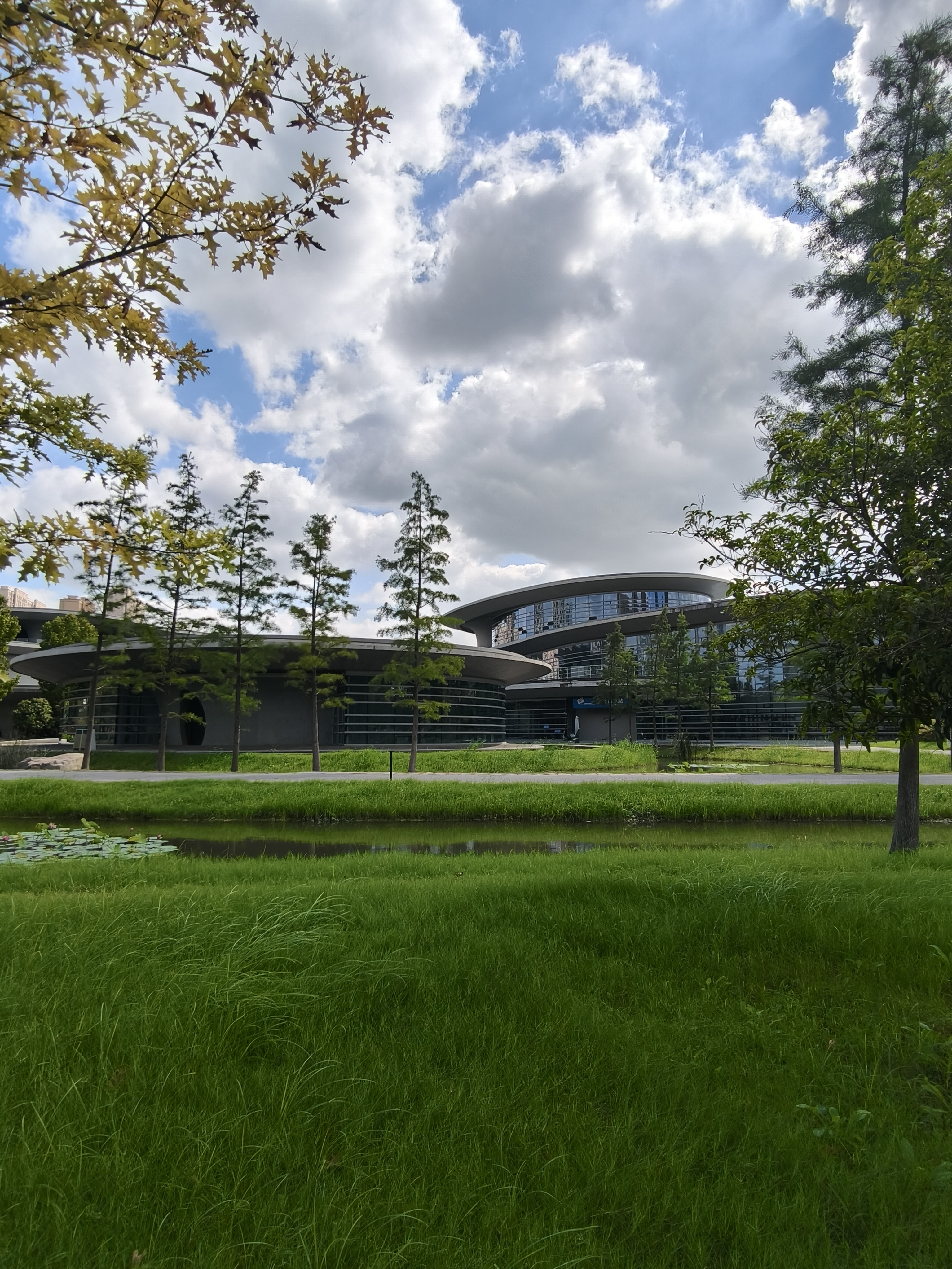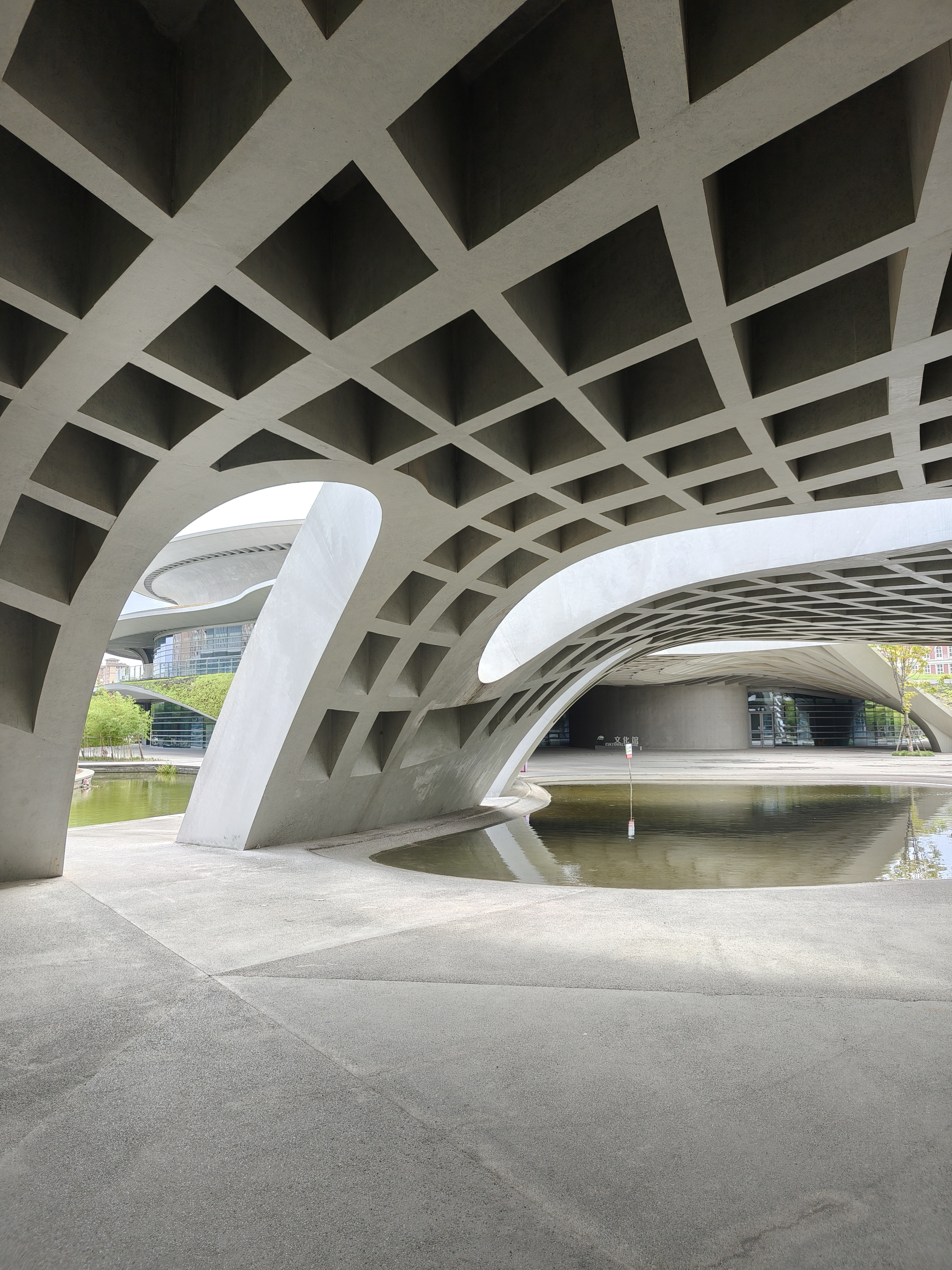 个人感觉最有特色的还是金港文化中心的外观建筑,建筑的线条很独特,几何结构搭配光影,本身就很有艺术感 水面像面镜子,把上方的建筑、天空、绿植都“复制”下来,虚实交融,画面一下就有了层次感。