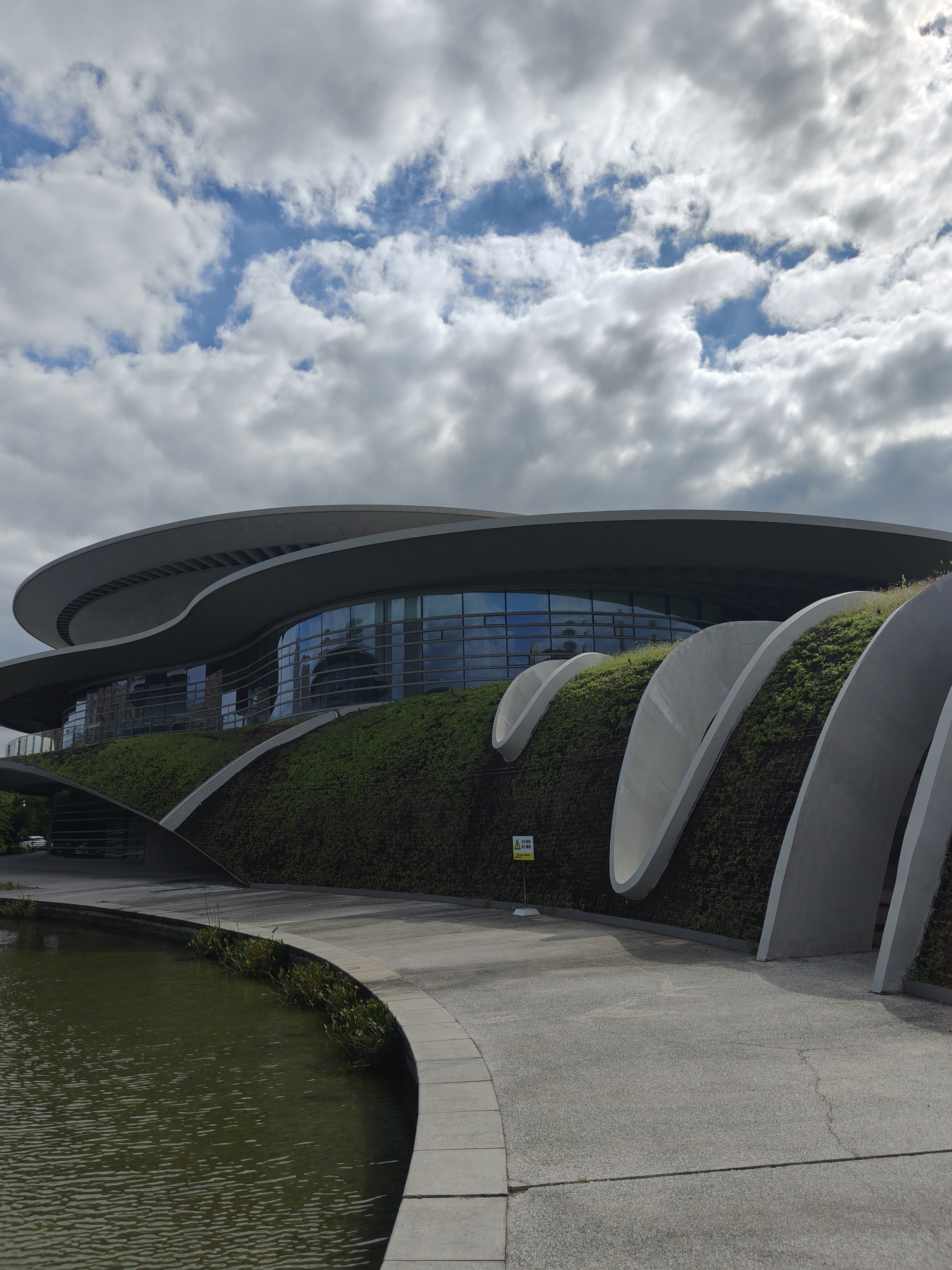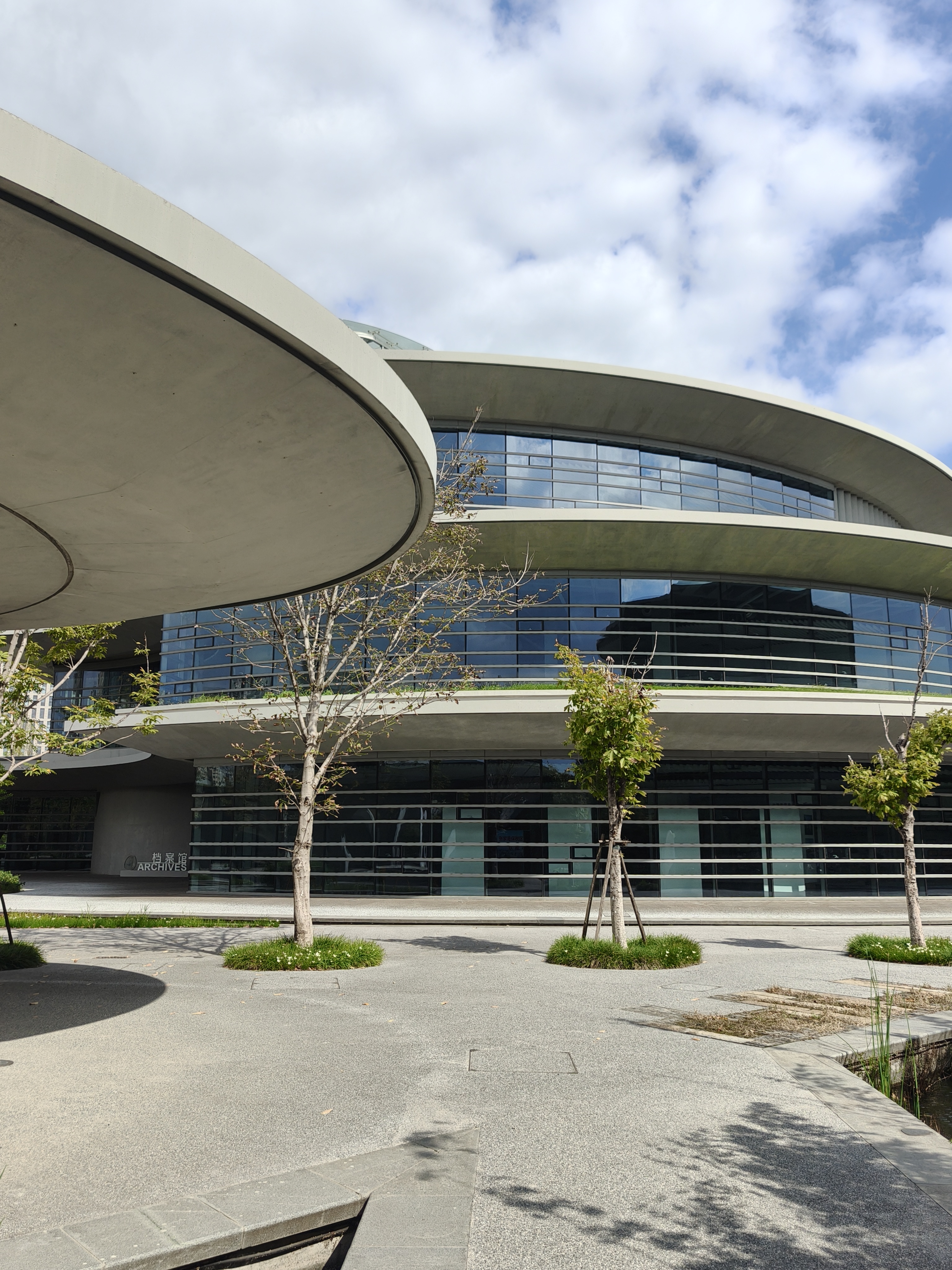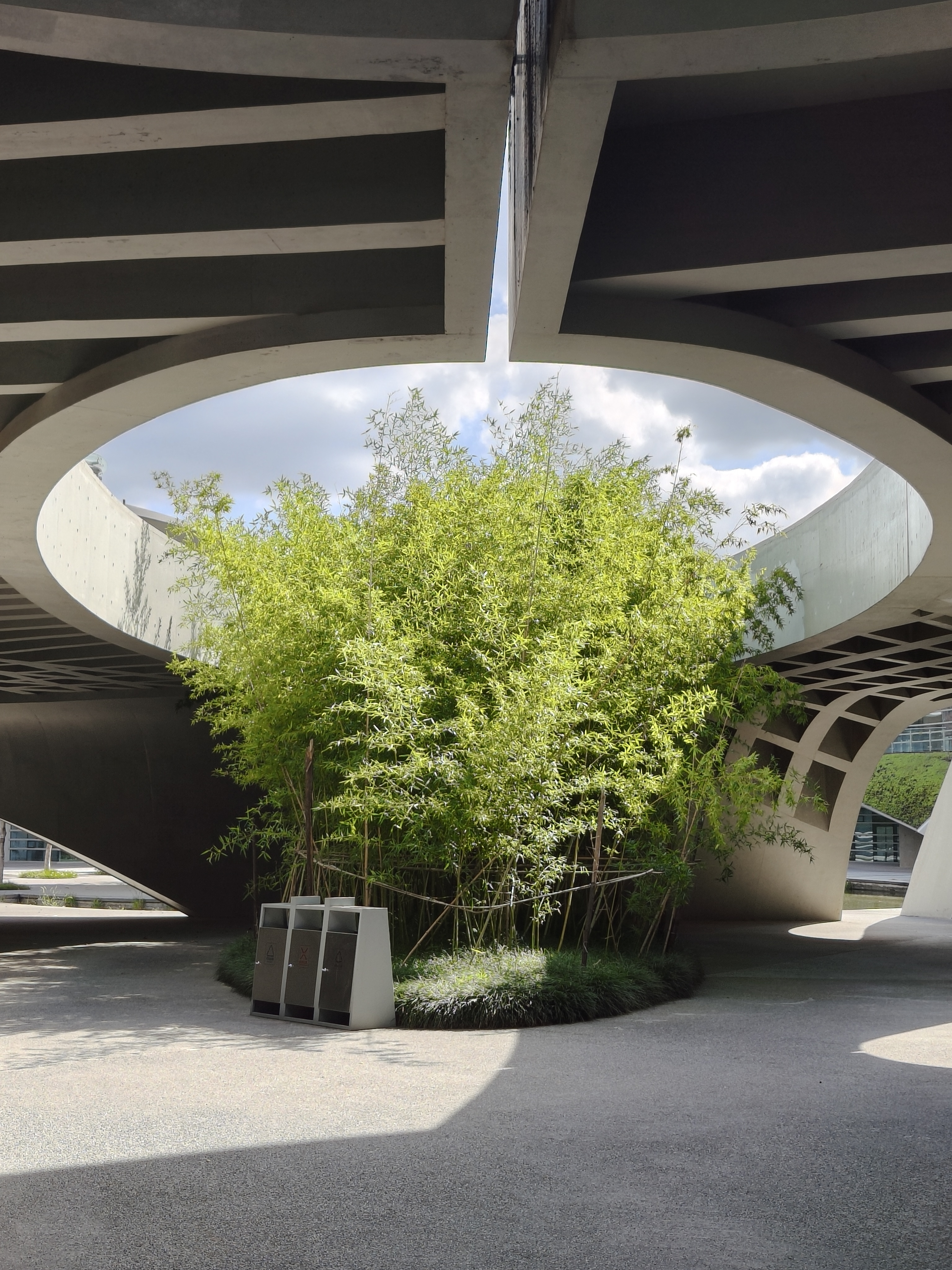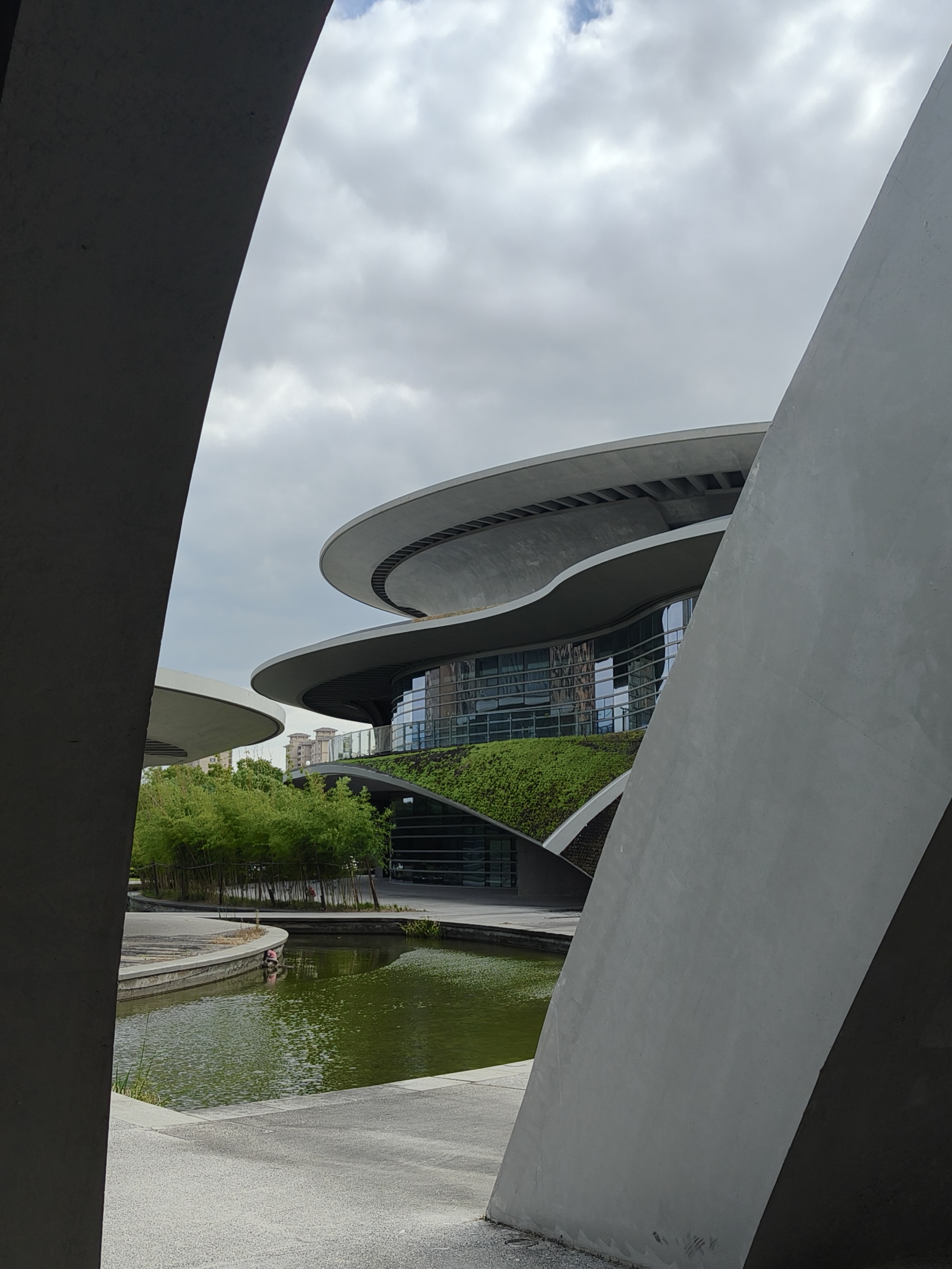 个人感觉最有特色的还是金港文化中心的外观建筑,建筑的线条很独特,几何结构搭配光影,本身就很有艺术感 水面像面镜子,把上方的建筑、天空、绿植都“复制”下来,虚实交融,画面一下就有了层次感。