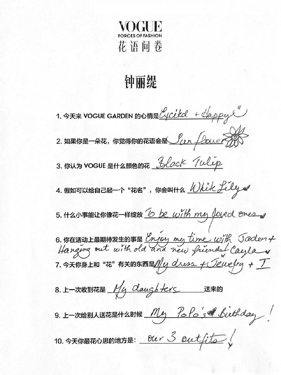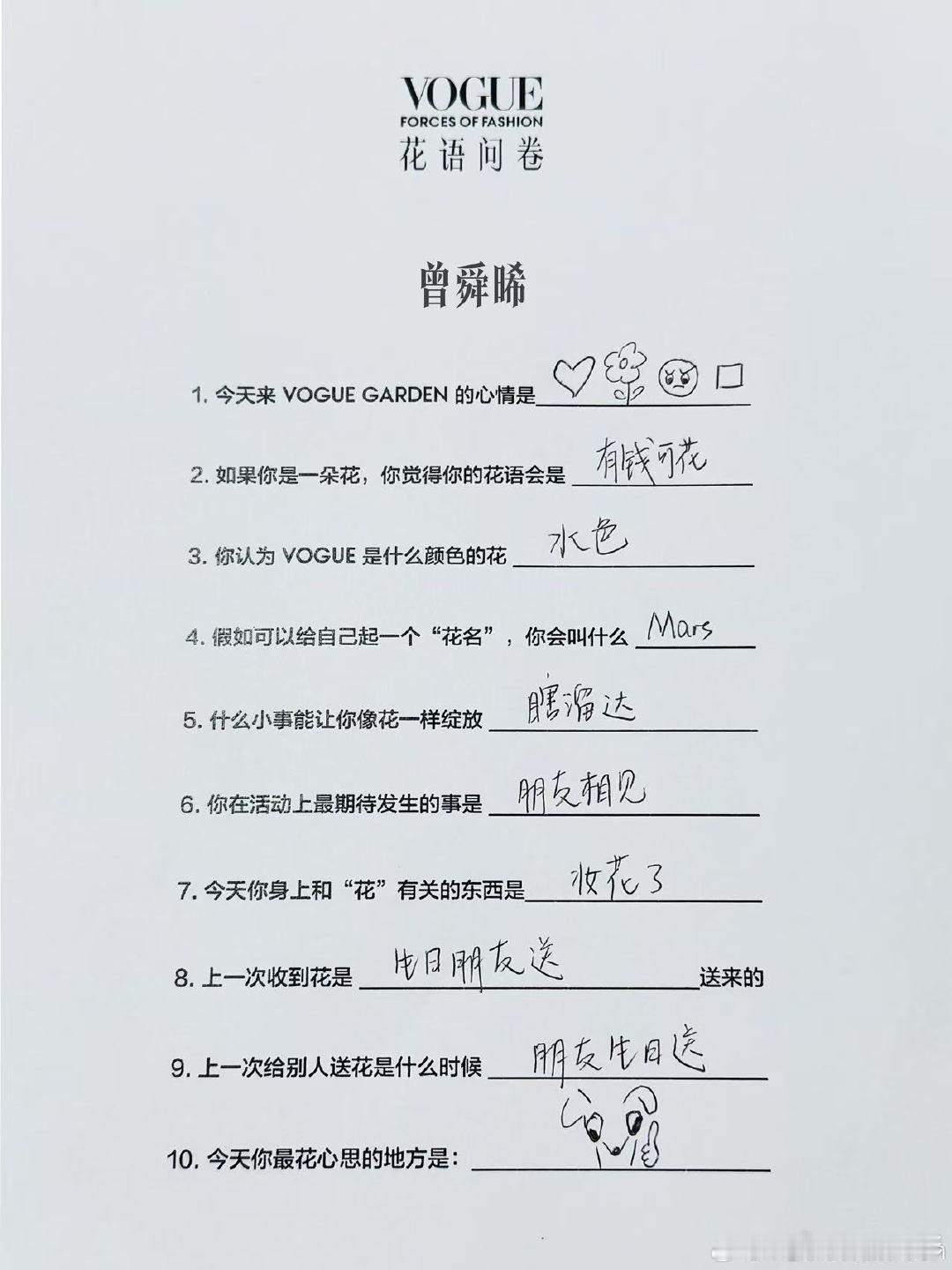 VOGUE花语问卷VOGUE花语问卷公开!刚刚vogue公开了曾舜晞、龚俊、金晨、宋雨琦、李沁、卢昱晓、张凌赫、娜扎、张予曦、钟丽缇、马思纯的花语问卷!