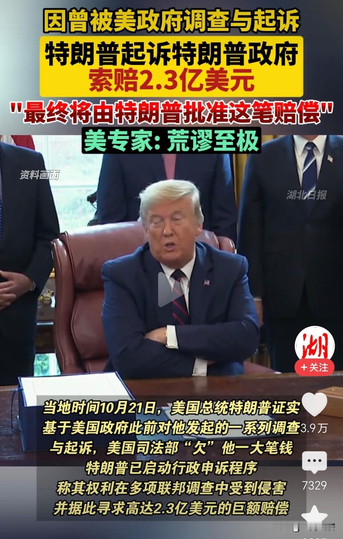 美国公民特朗普起草了起诉书,启动行政申诉程序,起诉特朗普政府,索赔2.3亿美元。然后由特朗普总统批准是否赔偿这笔巨款。虽然这事讲起来,非常的绕口,像绕口令一样。但是大致上,就是这个意思。因为他认为自己的权利受到了侵害,所以发起了维权行为。只不过,这次的原告、被告、法官都是他自己。这在美国历史上,是非标罕见的!