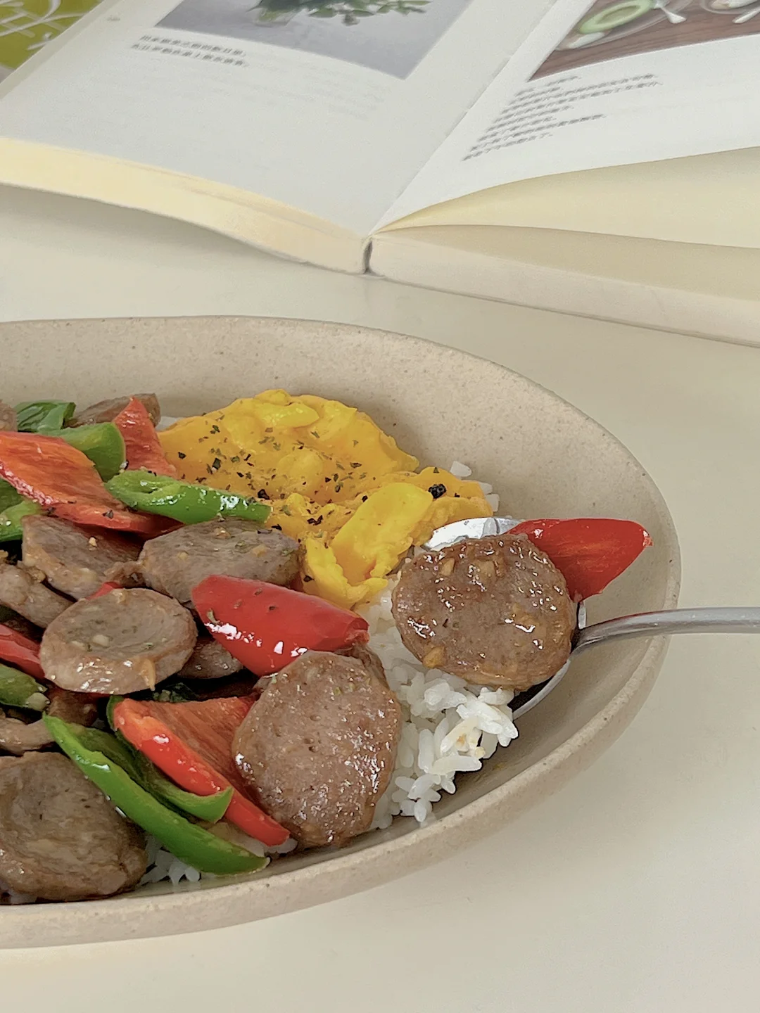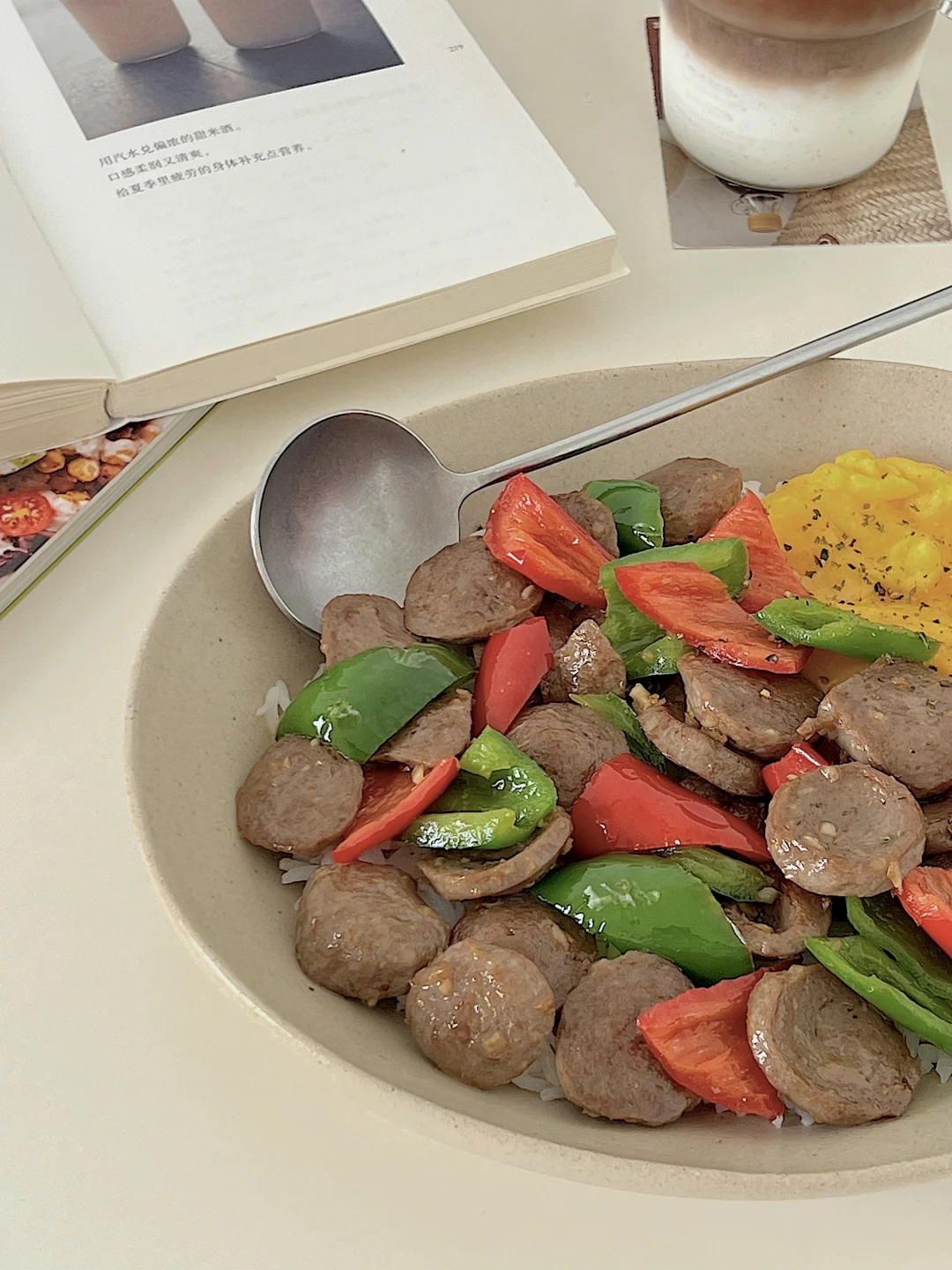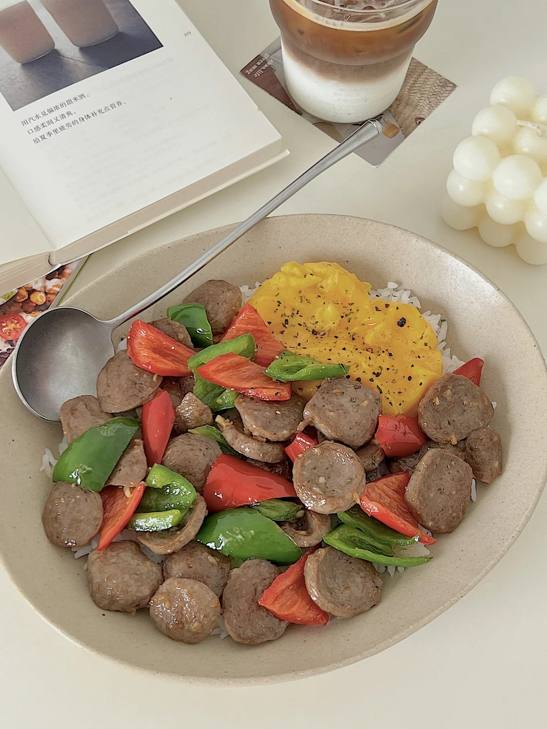宅家一人食|辣椒炒牛筋丸滑蛋盖饭🍱拿铁☕️