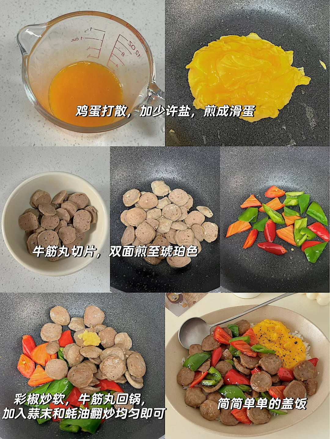 在牛肉丸和牛筋丸之间犹豫了一秒,选择了牛筋丸,嘿嘿,提供简单的做法,我帮你们吃了,觉得👍这样 做法: ✨鸡蛋打散加少许盐🧂煎成滑蛋 ✨牛筋丸切片,煎至两面琥珀色,盛起备用 ✨辣椒炒软,牛筋丸回锅,加入蒜末、蚝油炒均匀即可 牛筋丸配拿铁☕️,中西结合仪式感到位,都去做吧~