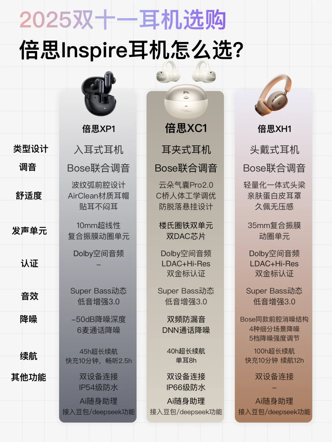 大家是不是又想趁着双11的到来,换一换身边的耳机了?这次倍思联合 Bose 推出的 Inspire 系列耳机,不仅音质大升级,而且一次性推出耳夹式、入耳式、头罩式三款耳机,每款配置都很顶!