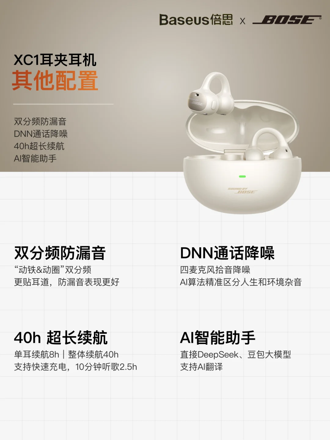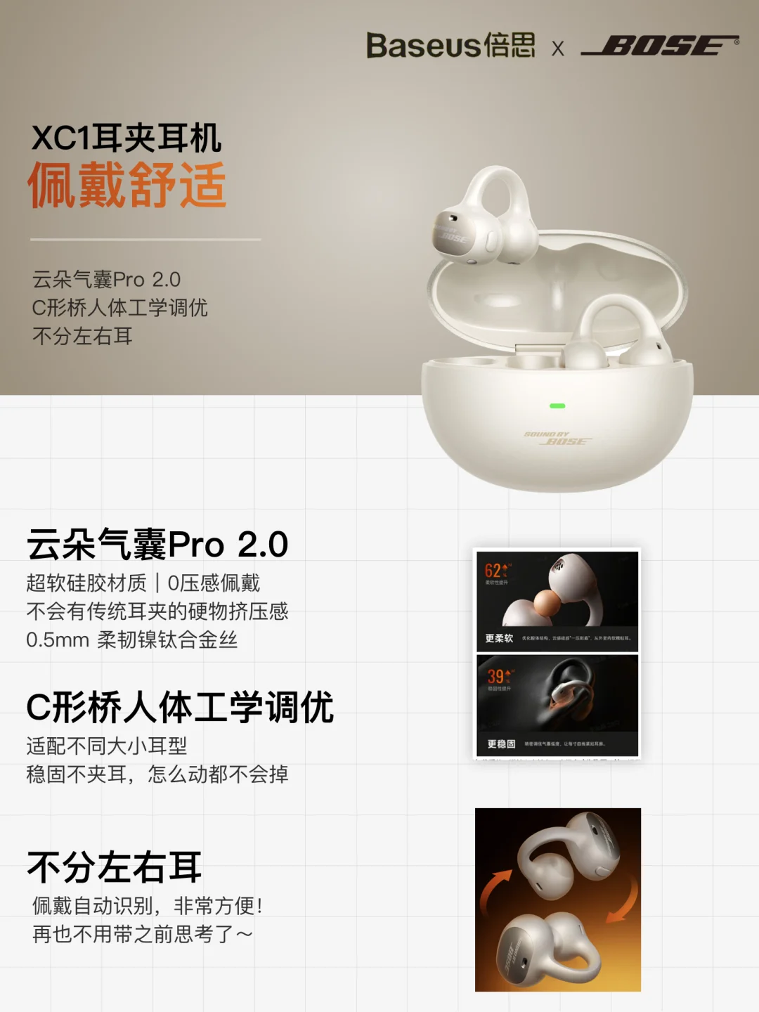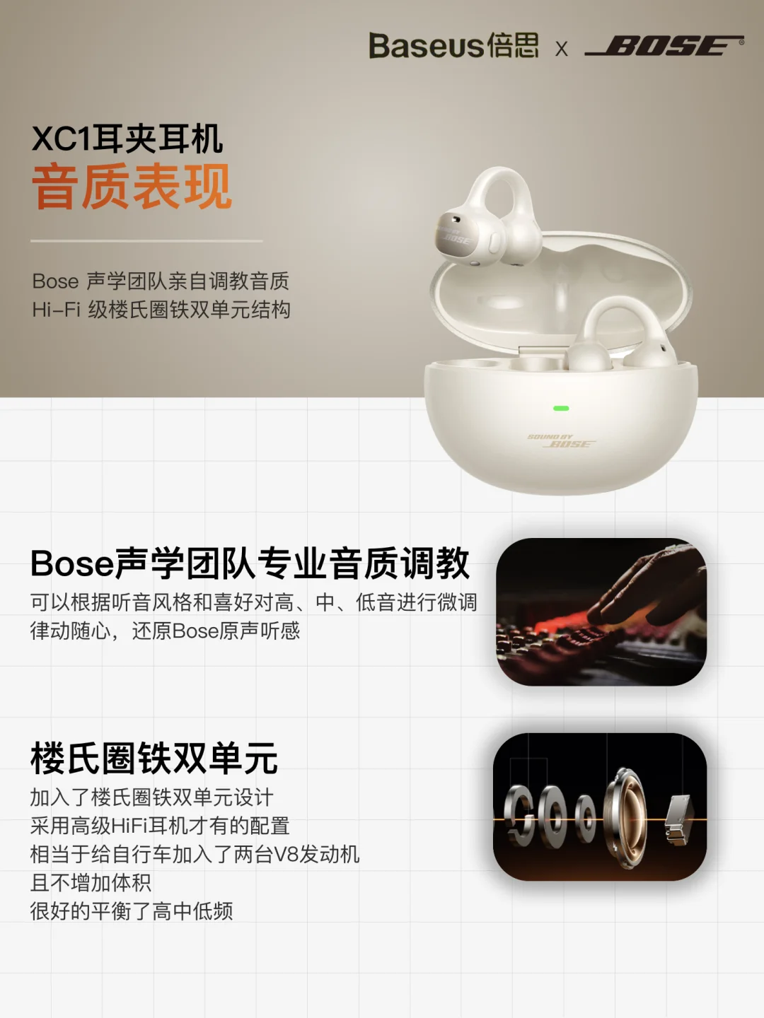 在耳夹式耳机最难的防漏音上,倍思XC1 用动圈&动铁双分频技术,让高音直达耳道不漏音。