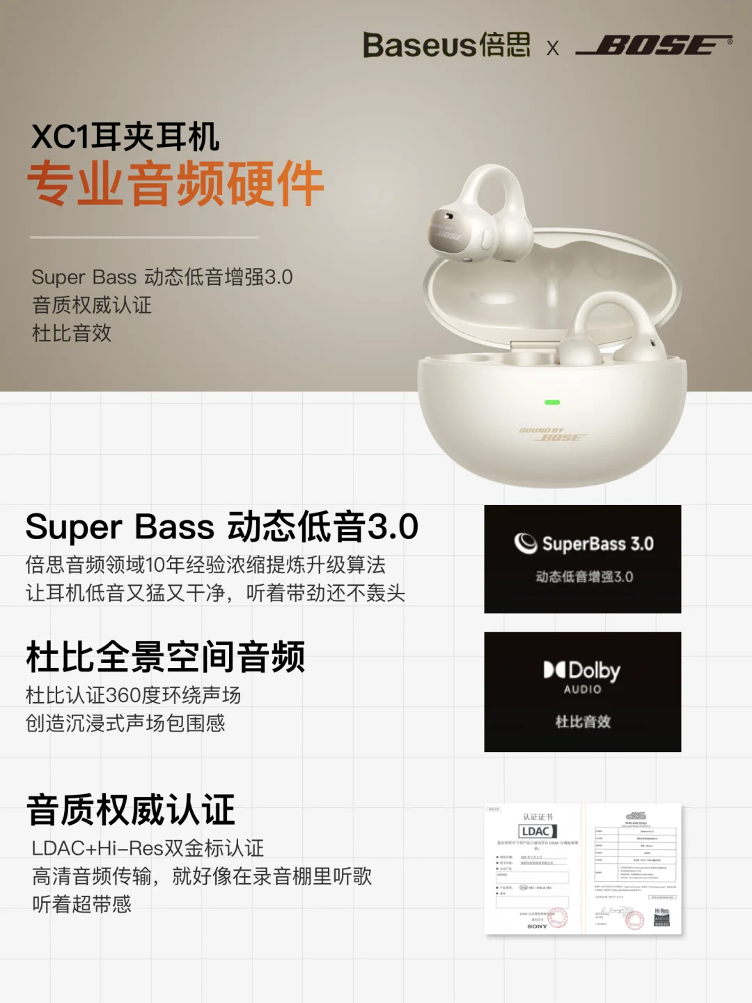 虽然是开放式,但是音质也是旗舰级。倍思联合 Bose,Bose负责调音把控音准,倍思负责攻克技术难关,搭配楼氏圈铁双单元设计,再加上LDAC和Hi-Res双金标认证加持,音质细节还原度大大提升。