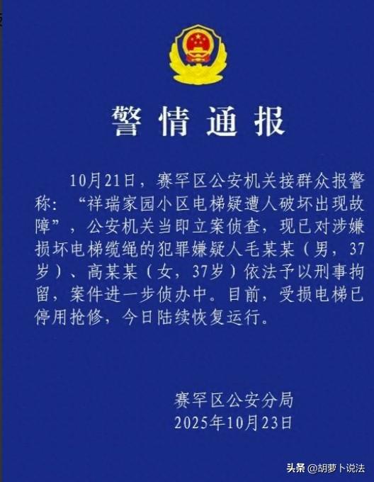 内蒙古呼和浩特,电梯检修人员对电梯进行日常巡检,结果发现50部电梯有23部电梯,它们的承重钢绳,竟然被人为恶意切割,他们赶紧停机锁定电梯,报了警,揪出了背后的始作俑者。 真是太可怕了,当时电梯检修人员,对于小区内50部电梯进行全面巡检,就发现了其中一部电梯,电梯的承重钢绳,竟然存在人为切割,都快要断了,如果投入运行,肯定会发生桥厢坠落的情况。 那真的会非常危险,小区里的电梯房都是高层,一旦有人在里面使用电梯,坠落到1楼,那是人命关天的事情。 一开始电梯检修人员发现钢绳有切割的痕迹,还以为是电梯出现了异常情况而已。 不过这非同小可,他们细细检查,确认这就是人为的,他们也不排除这种情况,毕竟,小区这么大,有人对电梯使用有意见,或者对小区管理有意见,都是很正常的。 一想到这些,电梯检修人员害怕了,他们就担心这不是巧合,于是赶紧对所有的电梯进行检查。 这一检查吓了他们一身冷汗,他们发现50部电梯就有23部电梯有这种情况。 钢绳的切割痕迹,都如出一辙,这肯定就不是意外了,他们确认是有人为切割承重钢绳的。 确认了这一情况,检修人员不敢大意,马上停机锁定这些电梯,丝毫不敢犹豫。 要知道23部电梯,一天24小时总会有人上上下下,一旦电梯在运行的过程中,承重钢绳承重不了了,就会产生严重的后果。 还好他们发现的及时,也及时采取了防护措施,这件事才没有造成严重后果,更没有人员伤亡。 但这件事让大家陷入了恐惧中,到底是谁要干这样的事情,这个人又到底是谁,他们得找出来。 要是找不到这个人,他能破坏23部电梯,就能破坏剩下的27部电梯,这个人一天没有抓到,小区的业主门都不敢使用电梯,谁也不知道危险在哪一刻发生。 这件事让整个小区的业主们都人心惶惶,害得大家都不敢坐电梯,生活受到严重的影响,大家相互猜测,这个破坏电梯的人,到底为何要做这样伤天害理的事情。 他们一刻也不能等待,都希望一个破坏电梯的人,能够赶紧找到,或者他出来承认此事,有什么事情可以好好商量,不要做这样的事情,让大家担惊受怕。 电梯检修人员发现此事后,也已经上报,并且报了警。 在大家的努力下,他们终于找到了破坏电梯的人,就是高某和毛某,这一男一女,分工合作,配合得很好,成功地切割了23部电梯承重钢绳。 找到这一对男女,大家都松了一口气,虽然大家不知道,这一对男女心中到底有何怨恨,非得要如此破坏电梯。 大家认为,不管他们心中到底有何冤屈,有何愤怒,或者有何理由,都不应该拿全体业主们的生命来做筹码。 那么如何认定这件事情呢? 1、 高某和毛某破坏23部电梯,价值金额高,已经构成了故意毁坏财物罪。 《刑法》第275条规定:故意毁坏财物罪是指,故意毁坏公私财物,数额较大或者有其他严重情节的,处三年以下有期徒刑、拘役或者罚金;数额巨大或者有其他特别严重情节的,处三年以上七年以下有期徒刑。 对于23部电梯的经济损失,他们肯定是要赔偿的。 2、 切割电梯的承重钢绳,这行为已经构成了危害公共安全罪。 《刑法》第114条规定:以其他危险方法危害公共安全,尚未造成严重后果的,处三年以上十年以下有期徒刑。 如果没有及早被发现,这个小区肯定会闹出人命,事情非同小可。 那么,你对破坏电梯这件事情有何看法呢? (来源:大河报 2025年10月23日)