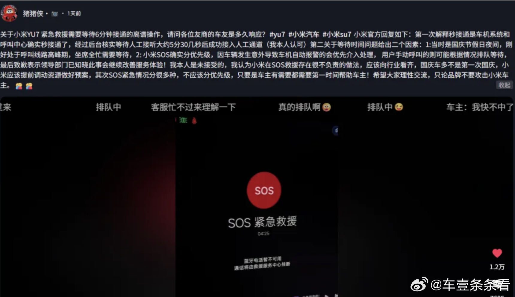 值得注意的是,此前,有自称小米SU7的车主在社交平台发文称,小米SU7的SOS紧急救援需等待约6分钟才能接通,太离谱。