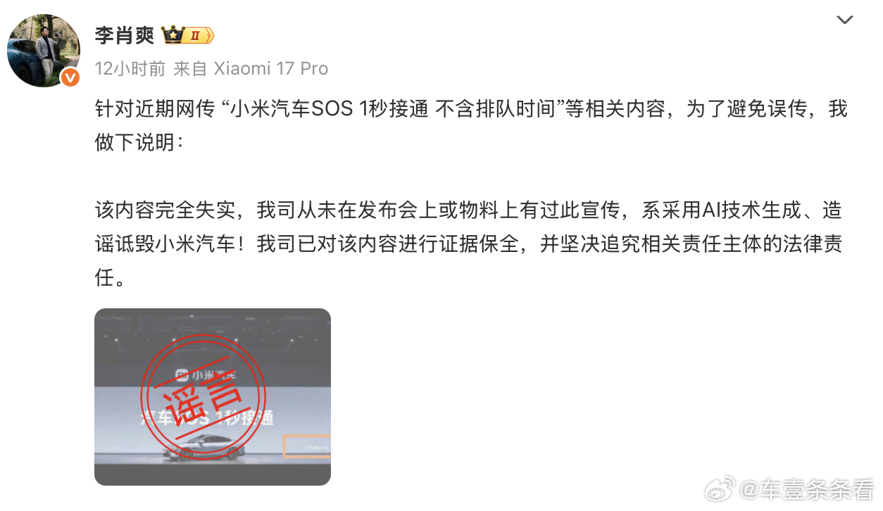 10 月 22 日晚,小米汽车副总裁李肖爽深夜发文怒怼谣言,称“小米汽车 SOS 1 秒接通 不含排队时间”的说法纯属伪造,系AI生成的诋毁内容,公司从未有过此类宣传。​