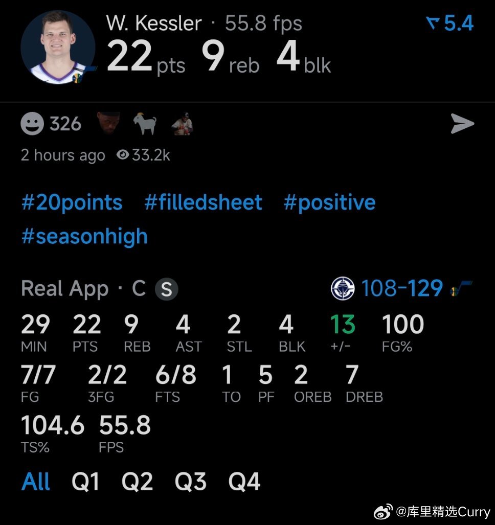 凯斯勒赛季首秀29分钟,7投7中,三分2中2,罚球8中6砍下22分9篮板4助攻2抢断4盖帽全面数据,正负值+13。