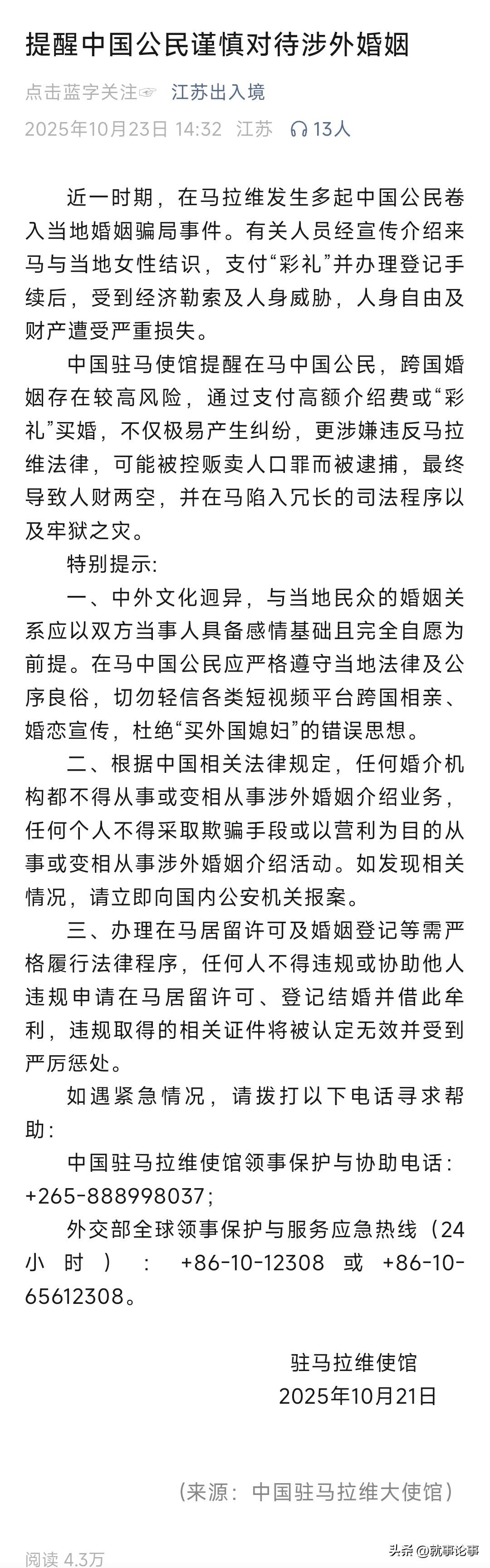 江苏出入境管理中心提醒,谨慎对待涉外婚姻!小心是骗局!!! 这种骗局可能不只是在文中提到的国家,其他国家也有发生,好在被骗的只是钱财,现在有很多国内女性为了结交“老外”,想要一门跨国婚姻,结果却不如意,陷入骗局或者困局。中外文化差异较大,对于跨国婚姻还是谨慎为好。