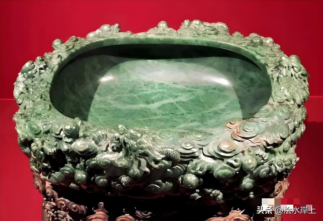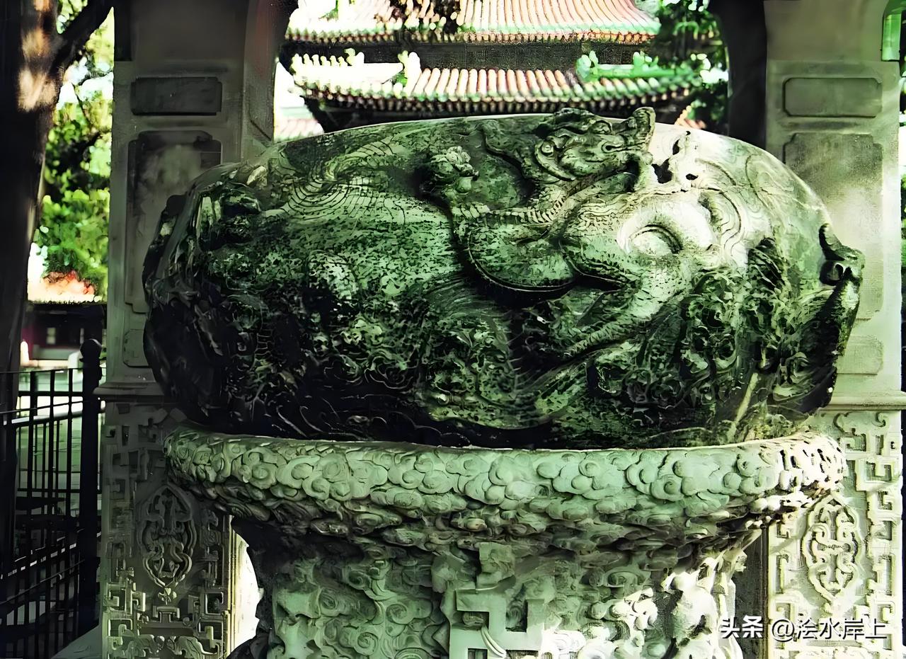 乾隆偶然巡幸真武庙时发现个大秘密,道士用了300年的腌菜缸(故意使用),竟是元朝镇国神器渎山大玉海(现存北海团城玉瓮亭)。元世祖忽必烈以举国之力,采整块7000斤南阳独山美玉,由皇家玉工,采用浮雕、线雕、俏色传统技艺,历经数年打造的巨无霸酒瓮(可盛酒700余升,放置广寒殿犒劳群臣)。波涛汹涌的大海,海浪起伏中,海豚海马海犀游戏其中,动物形象写实浪漫相结合。“海量”(大玉海)是目前最大的玉雕,独山玉玉坛顶峰的标志,九大镇国之宝之首。