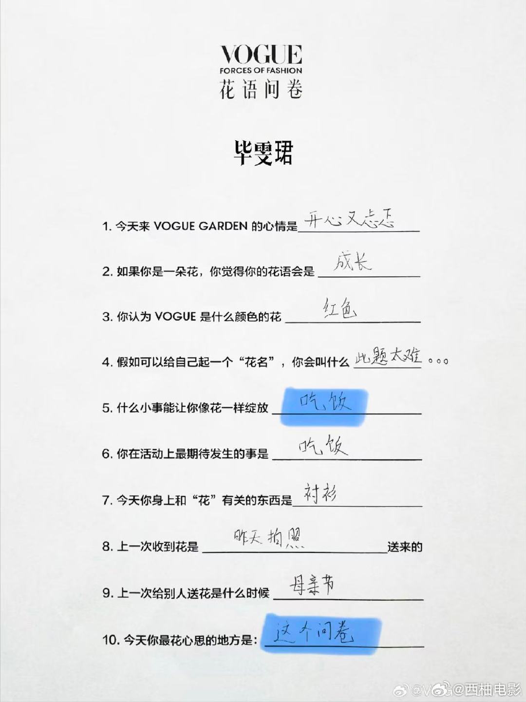 毕雯珺最花心思是填vogue问卷毕雯珺说吃饭可以让我像花一样绽放VOGUE花语