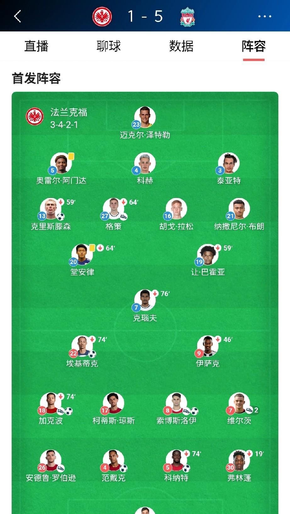 利物浦客场5-1翻盘法兰克福,替补出场的萨拉赫会不会有点尴尬。 本赛季刚以40万磅周薪续约的萨拉赫,联赛前8轮仅取得2球2助,欧冠1球1助,并且这些进球和助攻都是赛季初联赛和欧冠6连胜期间取得的。而最近4场比赛萨拉赫颗粒无收,联赛8次射门仅2次射正,利物浦罕见遭遇联赛3连败,3个1-2不敌水晶宫,切尔西和曼联,联赛排名从榜首滑落到第4。而且欧冠0-1爆冷客场不敌加拉塔萨雷,双线受挫。夏窗豪购的几大新援埃基蒂克,维尔兹,伊萨克都陷入水货质疑。万般无奈下,主帅斯洛特改打双中锋,让埃基蒂克、伊萨克搭档和维尔兹全部首发出场,萨拉赫坐替补席待命。没想到收到惊人效果,在第26分钟先丢球的情况下,利物浦绝地反击连进5球。埃基蒂克进1球,维尔兹2助攻,加克波1球1助,索博1球1助,2大中卫范迪克和科纳特各入一球。