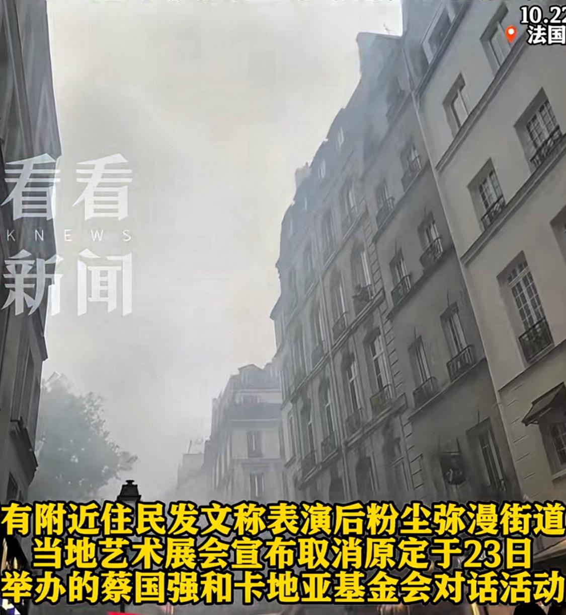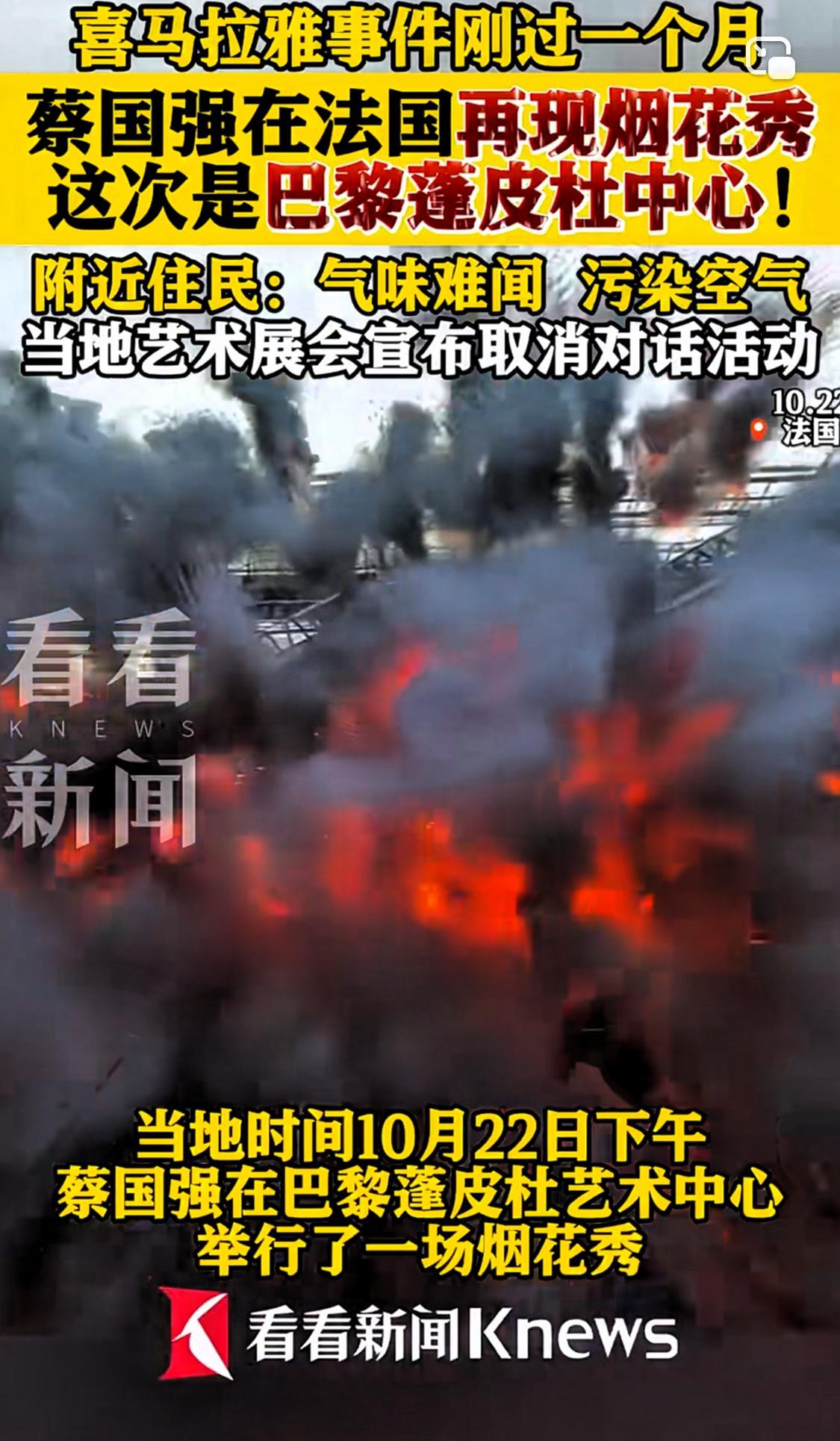 蔡国强“炸”完喜马拉雅后又在法国巴黎蓬皮杜艺术中心搞了个“最后的狂欢”烟花秀,看来这老小子还是很有能量的,国内外还是有不少人吃他这一套。也说明“炸山”并没有对其有特别大的影响。 根据之前官方通报,蔡国强工作室和赞助商只负责赔偿和生态修复,本人倒是没啥事,倒是地方官员被处理了不少。不过也不奇怪,毕竟蔡只是个申请+执行人,拍板和审批的人确实更可恶,但作为联合申请人和始作俑者,本人几乎没啥事确实让不少人不舒服。 不过蔡国强10月22日白天在巴黎搞的烟花秀虽是在城市里搞的,不存在破坏生态问题,但依然存在很大争议。现场有人对此表示欣赏并拍手叫好,也有人因表演产生了大量浓烟,导致整条街被烟雾笼罩,能见度降低,并有刺鼻气味而发出嘘声,甚至有人举牌抗议,抗议内容关联到蔡国强此前在西藏的烟花秀争议。 作为主办方的蓬皮杜艺术中心官方在事后还特意发布了绚丽的现场视频,不过部分网友质疑其真实性,认为与现场感受到的“黑色帐篷”般的效果不符。 有意思的是,在烟花秀结束后,原定于10月23日举行的《激荡新视野:蔡国强和卡地亚基金会》对话活动被不明原因突然取消…… 要我说,只要不在我国秀,他在国外想怎么搞都行,最好跑到日本富士山、靖国神社等地方搞,我还敬他是个汉子。