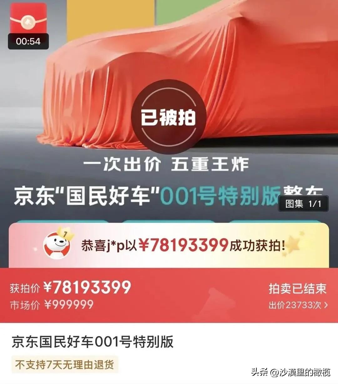 一台10万级国产车竟然被拍出7800万天价。真会玩!!! 就在昨天京东首款汽车001号线上竞拍,从1块钱开始起拍,价格持续4个小时一路狂飙,最后成功拍到了7819万。好家伙,这简直就是天价!史上最贵国产车就此诞生? 这台打着京东旗号的车到底什么来头?简单来说就是京东联合广汽和宁德时代共同打造的新能源车,它的名字叫埃安UT super,广汽的设计,宁德的电池,京东的生态,你可以说它是“强强联合体”,也可以说它是“拼好车”,车方面就没什么好说的了… 车子不贵,预售价10-12要元,唯一让人担心的是,京东一旦进军汽车圈,以后东哥的信誉和口碑还能不能保住?毕竟汽车行业的水太深了。 一台10级国产车,花7000多万拍下,那不是妥妥的大冤种吗?当然不是,因为按照拍卖规则,如果出价者最后放弃支付或是取消订单,也就是扣除保证金100元。玩哪!!!