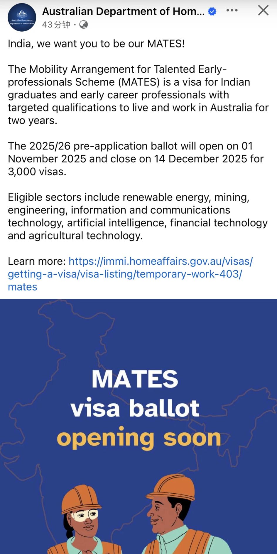 澳大利亚移民局向印度人发出邀请:澳大利亚将为才华横溢的印度人发放签证,允许这些印度人在澳大利亚居住和工作两年,澳大利亚希望这些印度人符合条件,是行业需要的人才,比如:信息技术和通信技术、人工智能、金融科技和农业技术、可再生能源、采矿、工程。
