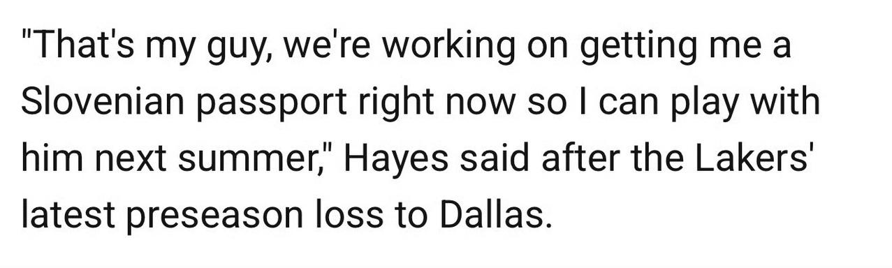 深度捆绑?海斯欲跟随东契奇征战国际赛场! 海斯前几日在采访中表示,他正在申请斯洛文尼亚护照,这样就可以与东契奇一同征战国际赛场!不得不说东契奇的国家荣誉感确实强,年年参加国家队比赛,甚至不顾独行侠反对打止痛针上场,前面挖加福德的事没着落,海斯又被他续上了!当然,反过来说海斯这事业运还在继续,如果进展顺利对他意味着事业上的双喜临门: 1.能够参加国际比赛,对拓展商业价值有很大帮助,会有更多广告赞助等额外收入;赛场表现也会被各俱乐部注意到(包括NBA球队),说句不好听的即便淡出联盟可能还会有其它联赛对他感兴趣。 2.东契奇作为基石已经与湖人锁定未来多年合作,考虑到两人同属一家经纪公司,海斯的曝光度与合同也就有了保证(联盟里的人情事故早已不是秘密),回到球场上东契奇的喂饼能力,就是海斯的数据保障,两人上赛季也展示了默契。海斯还年轻如果能继续提升,有希望获得更大的合同,再差也能保证一份底薪,他要做的就是继续努力镀金。 另外海斯还抱怨了美国队从不在这方面进行公开试训选拔,这话听着就多少有点天马行空了,历来美国队选人都围绕着各NBA球队的核心级别运动员,并且锋线和后卫占绝大多数,像海斯这种蓝领定位的球员至少也得最佳防守人级别,因此就算公开选拔大概率他也无法入选。 可以说如果上赛季没有东契奇的从天而降,今年休赛期他就会面临找工作的困境,希望海斯抓住来之不易的好运努力提升自己,增加对抗能力,丰富终结手段等!加油啦幸运儿!