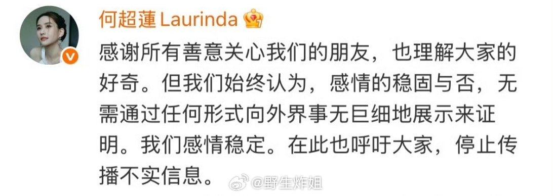 对于之前向太爆料的富家女跟男明星闹离婚一事,闹的沸沸扬扬好几天了,窦骁和何超莲这两位正主终于出来回应了,说双方感情稳定,至于有没有领证只字不提…… ​​​