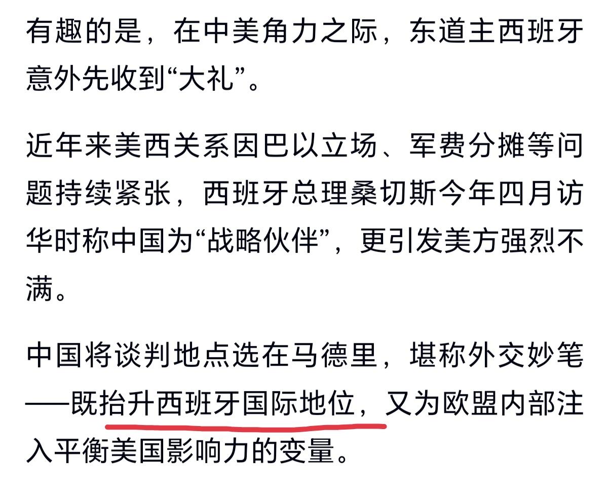 仅从与中国的友好程度来看,最近这两次中美经贸磋商的地点分别放在西班牙和马来西亚,大概率都是由中国选定的,在一定程度上和一定范围内可以被视为是中国的影响力优势(有点儿类似于主场优势),透漏出美国更着急更急于解稀土之困大豆之困…!中美角力,西班牙、马来西亚国际地位抬升。